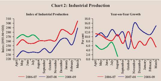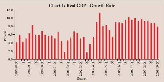 The Indian economy continued to record robust growth during the first quarter of 2008-09 (April-June), although the pace of expansion moderated in comparison with the average growth rate of real GDP during last five years. According to the first quarter estimates of 2008-09 released by the Central Statistical Organisation (CSO) in August 2008, real GDP growth was placed at 7.9 per cent during the first quarter of 2008-09 as compared with 9.2 per cent during the corresponding quarter of previous year and 9.0 per cent during 2007-08. The deceleration was spread across all the three sectors, viz., agriculture and allied activities, industry and services (Table 1 and Chart 1). The growth rate of real GDP during the last five years (2003-04 to 2007-08) averaged 8.8 per cent. The moderation during the first quarter of 2008-09 reflected a cyclical downturn, while the structural drivers of the growth process continued to be favourable. Notwithstanding the moderation, the growth rate of the Indian economy continuous to be one of the highest in the world.