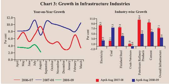 The Centre for monitoring Indian Economy (CMIE) revised their estimate for overall industrial growth downwards to 8.3 per cent from 9.1 per cent for 2008-09. According to the CMIE, the downward revision reflected specific problems faced by certain industries rather than any general industrial slowdown. On the other hand, the growth projections were revised upwards for those industries which performed better than expected during the current financial year so far. Sectors such as electricity, crude oil and petroleum products, according to the CMIE, are likely to show acceleration in growth in the second half of the 2008-09 and push up the overall industrial growth. Furthermore, the CMIE has again raised the issue of inadequacy of the estimates of industrial production (as per the IIP) in capturing the actual production trends.
