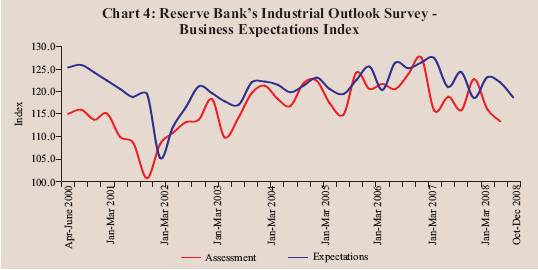 The results of professional forecasters’ survey conducted by the Reserve Bank in September 2008 suggest further moderation in economic activity for 2008-09 on the whole (Table 14). The median forecast of real GDP growth for 2008-09 was 7.7 per cent in the fifth round of the survey (September 2008) as compared with 7.9 per cent in the previous round (June 2008). The sectoral growth rate forecasts for the agriculture and services were, however, kept unchanged. The sectoral growth rate forecast for industry was placed at 7.0 per cent as compared with 7.5 per cent in the previous round. The annual growth rate of imports was expected to be 27.2 per cent as compared with 29.5 per cent.