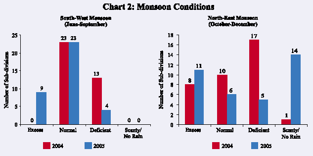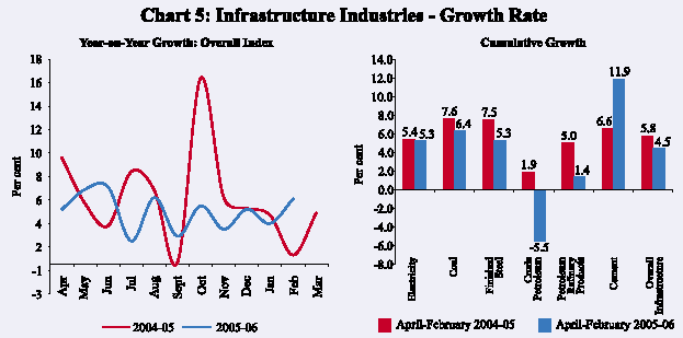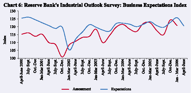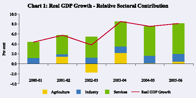 The Indian economy exhibited a strong performance during 2005-06, led by sustained growth in the industry and the services sectors. According to the advance estimates of the Central Statistical Organisation (CSO), real GDP growth accelerated from 7.5 per cent in 2004-05 to 8.1 per cent in 2005-06 (Table 1). Growth in industry was propelled by the manufacturing activity which more than offset the deceleration in ‘mining and quarrying’. The services sector, which recorded double-digit growth for the second successive year, continued to be the major driver of economic activity, contributing almost three-fourth of overall real GDP growth during 2005-06 (Chart 1). Within the services sector, ‘trade, hotels, transport and communication’ and
