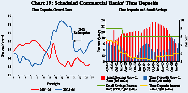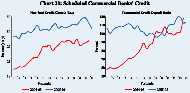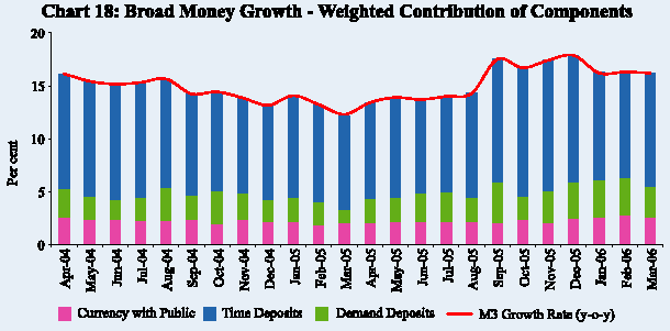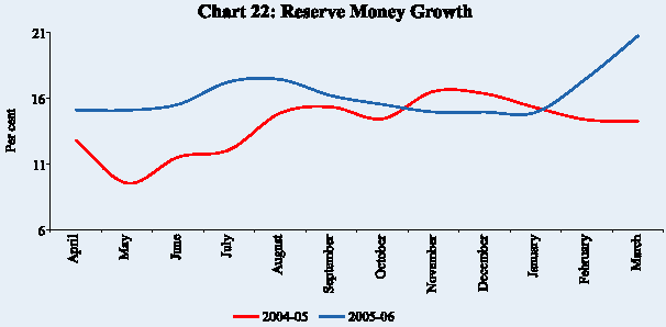 Monetary and liquidity conditions remained largely comfortable during 2005-06 although there was some tightness in liquidity conditions during the last four months of 2005-06 reflecting partly the impact of the redemption of India Millennium Deposits (IMDs). The Reserve Bank, therefore, injected liquidity through unwinding of the Market Stabilisation Scheme (MSS) and repo operations under the liquidity adjustment facility (LAF) along with some private placement of the Central Government securities. As a result, the banking system was able to meet the sustained pick-up in credit demand from the commercial sector. However, in the face of the rising demand for commercial credit, banks restricted their incremental investments in Government paper. Strong growth in deposits as well as access to non-deposit sources also enabled the banking system to meet the enhanced demand for commercial credit. Liquidity injecting operations of the Reserve Bank led to a rise in its net domestic assets (NDA) and a higher order of expansion of reserve money during 2005-06. Concomitantly, the year-on-year (y-o-y) broad money (M3) growth as on March 31, 2006 – at 16.2 per cent – was above the indicative growth of 14.5 per cent projected in the Annual Policy Statement in the beginning of the year (April 2005). In this context, it may be noted that data on fiscal year variation for 2005-06 are not comparable with those of the previous years as the data for 2005-06 include 27 fortnights while usually the data for a year include 26 fortnights. Moreover, the last reporting Friday of 2005-06 coincided with March 31, the closing day for banks’ accounts, thereby giving rise to the phenomenon of year-end bulge in aggregate deposits and credit (Table 20). Expansion in the new monetary aggregate (NM3) was higher than M3 on account of net outflows under foreign currency deposits, reflecting redemption of IMDs. Based on the recommendations of the Working is compiled on a Group on Money Supply (Chairman: Dr. Y.V. Reddy), NM3