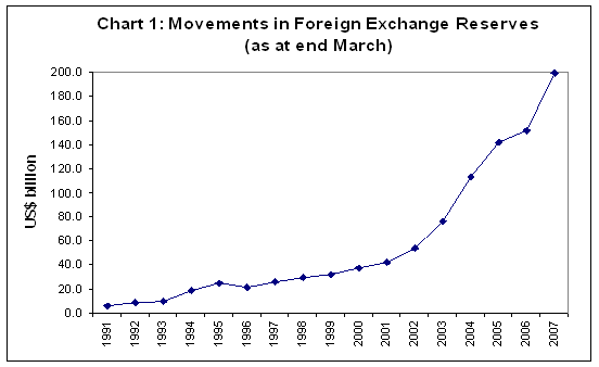 The level of foreign exchange reserves had steadily increased from US$ 5.8 billion as at end-March 1991 to US$ 113.0 billion by end-March 2004 and further to US$ 151.6 billion by end-March 2006. It stood at US$ 199.2 billion as at end-March 2007 (Table 1). Although both US dollar and Euro are intervention currencies, the foreign exchange reserves are denominated and expressed in US dollar only.