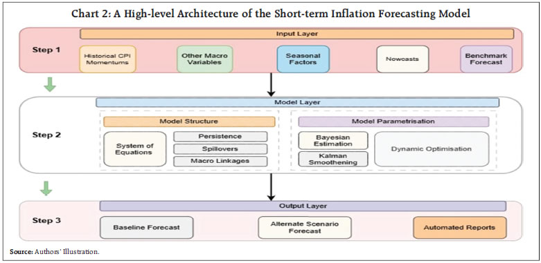 This section presents a high-level overview of the short-term inflation forecasting framework. It is engineered around a layered architecture that integrates diverse information sources, dynamic interlinkages and stochastic processes that allow nowcasts to converge to the benchmark forecast. The system is organized into three layers: the Input Layer (Step 1), the Model Layer (Step 2), and the Output Layer (Step 3) (Chart 2).