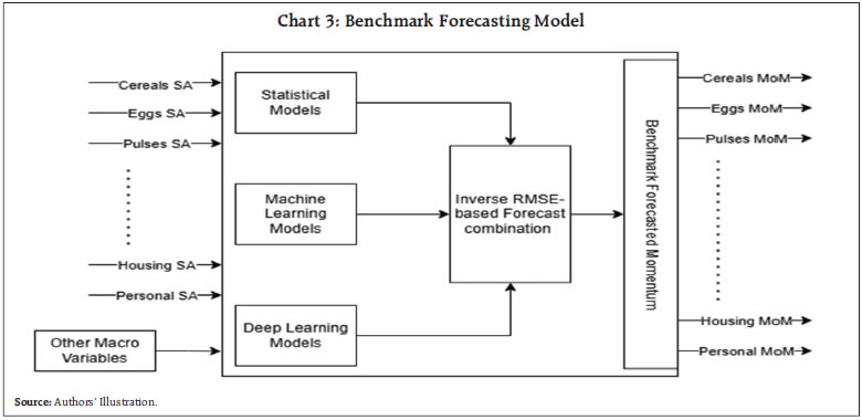 5. Benchmark Forecasts (model dependent forecasts): Benchmark forecasts are generated using a performance-weighted forecast combination approach (Mohan et al., 2025; John et al., 2020) using seasonally adjusted momentums for each of the 33 CPI sub-groups/components. For each component, this approach combines the forecasts from a suite of statistical, machine learning (ML) and deep learning (DL) models containing univariate and multivariate models, which includes autoregressive integrated moving average (ARIMA), vector autoregression (VAR), Bayesian VAR (BVAR), support vector machine (SVM), random forests, nonlinear autoregressive neural networks (NARNET) and long short-term memory (LSTM) models with different specifications. Thus, generating 216 forecasts for each of the 33 CPI sub-groups/components. Forecasts for individual models are then combined by weights generated using inverse of pseudo-out-of-sample5 root mean squared errors (RMSEs), separately for each of these 33 subgroups/ components (Chart 3).