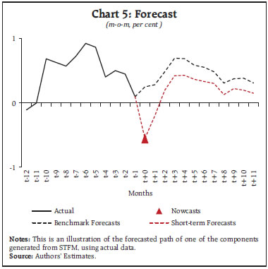4. Nowcasts (data dependent forecasts): The nowcast in this forecasting framework serves as the initial condition across the 33 CPI sub-groups/ components, separately. The nowcasting process is derived from a comprehensive full information matrix constructed using all available early price signals—both quantitative (e.g., daily mandi prices (Agmarknet, Ministry of Agriculture, Government of India (GoI)), daily wholesale and retail prices (Department of Consumer Affairs, GoI), in-house price surveys and qualitative inputs (e.g., media intelligence, supply-side government measures etc.). This matrix acts as a real-time intelligence dashboard, capturing the most recent developments in price behaviour across these components. These nowcasts reflect the near-term momentum in prices and act as the initial conditions for the short-term forecasting model.