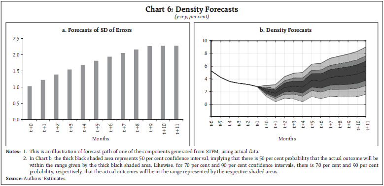 The Bayesian estimation is carried out using the Metropolis-Hastings6-Markov Chain Monte Carlo7 (MH-MCMC) method. For each parameter in the model, a prior distribution is specified as lognormal distribution centred around a prior mode, which are identified using single equation econometric methods. The MH algorithm iteratively draws from the proposed distribution and accepts or rejects samples based on the posterior likelihood, eventually converging to the target posterior modes as defined by Bayes’ rule. The estimation is governed by a set of convergence criteria, including tolerances on function values, subject to constraints and bounded by a maximum number of iterations. Once the posterior sampling is completed, the posterior modes are computed from the MCMC draws and stored for subsequent use in filtering and forecast generation. An adaptive random-walk Metropolis (ARWM) posterior simulator8 is used to draw samples from the prior distribution and uses estimated posterior modes to generates a large chain of iterations (here 5,00,000) to reach stationary posterior distributions. These distributions are used to generate 95 per cent credible intervals (CI)9. Further, the unobserved variables are filtered out using multivariate Kalman smoothing procedure10. Then, through a dynamic optimisation process11, the estimated system guides nowcasts towards the benchmark forecasts, which provide the point forecasts for each of the components and groups. Further, density forecasts for each of the variables are generated using multivariate and time-simultaneous prediction bands12. Here, the forecast mean square error matrices are used to generate the forecast error standard deviations (SD), which in turn is applied on the point forecasts to obtain the density forecasts, assuming a normal distribution13.