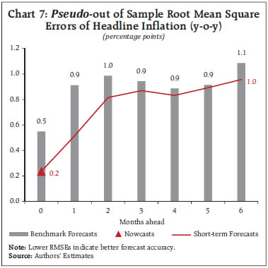 Pseudo-out of sample RMSE for y-o-y headline inflation is markedly lower in the near-term compared to benchmark forecasts indicating the advantage of full information based nowcasts in the near-term. As the horizon extends the accuracy of the short-term forecasts converges to that of the benchmark forecasts. The advantage of the benchmark model (based on inflation combination approach of a large suite of models) in terms of accuracy for generating forecasts in short-term horizon, relative to other models is already established in the Indian context (Mohan et al., 2025). Thus, the proposed framework leverages the advantage of nowcasts in the near-term, while ensuring enhanced forecast accuracy in the short-term. However, the overall accuracy of this framework depends on the accuracy of the nowcasts. This underscores the need for a consistent and accurate framework for generating nowcasts, rather than the full information matrix–based system presented in this article. Ideally, such a framework should integrate high-frequency, spatial, and multi-source data sets–an area identified for future research.