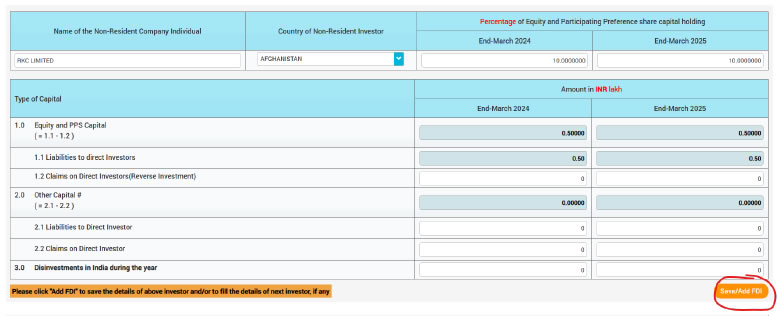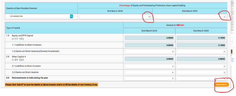 Please Note: For existing non-resident investor / non-resident investor countries’, the entity needs to use edit button and fill the details for previous year and current year and save/add FDI/DI button.