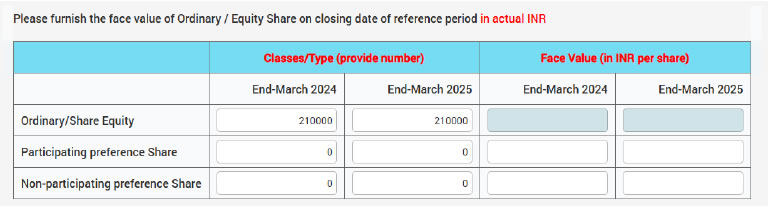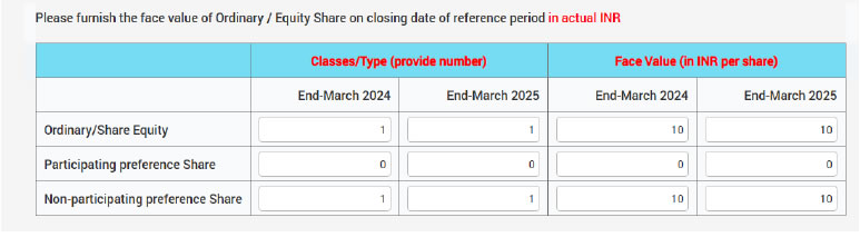 Ans: Paid up capital is automatically calculated with the help of your inputs given in 1.1(a), 1.1(b) and 1.2. Please note, the formula used for calculating the paid-up capital is given in Q35.