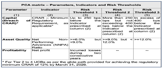 Risk assessment that is inherent to the banks business models, management, credit, liquidity, market, operational and systems and controls. ii) Off-site surveillance: In order to have continuous supervision over the UCBs, the Reserve Bank has supplemented the system of periodic on-site inspections with off-site surveillance (OSS) through a set of periodical prudential returns that will be submitted by UCBs to RBI. These returns are analyzed at RBI for identifying incipient indicators that may cause deterioration in the health of the banks. Sometimes, the analysis may also act as a trigger to take up a UCB for inspection before it is scheduled. Prompt Corrective Action (PCA) Framework The existing Supervisory Action Framework (SAF) for Primary Urban Co-operative banks has been reviewed vide DoS, Central Office Circular dated July 26, 2024, on Prompt Corrective Action Framework (PCA) for UCBs. The PCA Framework shall be applicable to all UCBs under Tier 2, Tier 3 and Tier 4 categories except UCBs under All Inclusive Directions. Tier 1 UCBs, though not covered under the PCA Framework as of now, shall be subject to enhanced monitoring under the extant supervisory framework. The exemption of Tier 1 UCBs from the PCA Framework shall be reviewed in due course. The objective of the PCA Framework is to enable supervisory intervention at an appropriate time and require the UCBs to initiate and implement remedial measures in a timely manner, to restore their financial health. The PCA Framework does not preclude RBI from taking any other action as it deems fit at any time, in addition to the corrective actions prescribed in the Framework. The provisions of the PCA Framework will be effective from April 1, 2025. Capital, Asset Quality and Profitability will be the key areas for monitoring in the revised PCA Framework. Indicators to be tracked for Capital, Asset Quality and Profitability would be CRAR, Net NPA Ratio (percentage of net NPA to net advances) and net profit, respectively. Breach of any risk threshold (as detailed under) may result in invocation of PCA.  A bank will generally be placed under PCA Framework based on the Reported/Audited Annual Financial Results and/or the ongoing Supervisory Assessment made by RBI. However, RBI may impose PCA on any bank during the course of a year (including migration from one threshold to another) in case the circumstances so warrant. Although supervisory action taken will primarily be based on the criteria specified under the PCA Framework, the Reserve Bank will not be precluded from taking appropriate supervisory action in case stress is noticed in other important indicators/parameters or in case of serious governance issues. Also, the Reserve Bank will not be precluded from taking any supervisory action other than those indicated in this circular, based on the merits of each case. Exit from PCA and Withdrawal of Restrictions under PCA - Once a bank is placed under PCA, taking the bank out of PCA Framework and/or withdrawal of restrictions imposed under the PCA Framework will be considered: a) if no breaches in risk thresholds in any of the parameters are observed as per four continuous quarterly financial statements, one of which should be Audited Annual Financial Statement (subject to assessment by RBI); and b) based on supervisory comfort of the RBI, including an assessment on sustainable improvement in key financials of the bank. Framework for Compromise Settlements and Technical Write-offs In terms of the extant regulations, credit related recovery matters of lending institutions are largely deregulated. Such recovery measures could be either through resolution of the stress in the borrowers’ accounts through various statutory or out of the Court mechanisms or it may be through compromise settlements. While certain regulations were issued to commercial banks and NBFCs with regard to undertaking compromising settlements/write offs, in the case of cooperative banks, RBI had not issued guidelines on compromise settlements, as respective State statutes require permission of the Registrar of Co-operative Societies (RCS) for waiver of any loan/ dues owed to co-operative banks. Hence, a comprehensive regulatory framework governing compromise settlements and technical write-off of loans covering all regulated entities (including UCBs, State Co-operative Banks and Central Cooperative Banks) was issued on June 08, 2023. The Framework covers inter alia the factors to be considered before considering sacrifice/waiver, norms for permitted sacrifice/waiver, delegation of power, prudential treatment, reporting mechanism, oversight by the Board, cooling period, treatment of accounts categorized as fraud and wilful defaulter. Provisioning for Standard Assets On April 24, 2023, the Reserve Bank harmonised the provisioning norms for ‘standard’ assets applicable to all categories of UCBs, irrespective of their tier in the revised framework. The direct advances to agriculture and small and medium enterprise (SME) sectors attract a uniform provisioning requirement of 0.25 per cent, while the provisioning requirement for advances to the commercial real estate (CRE) sector, commercial real estate - residential housing (CRE-RH), and all other standard advances is 1.00 per cent, 0.75 per cent and 0.40 per cent, respectively. Tier 1 UCBs, which were maintaining 0.25 per cent provisions on “all other standard advances” were permitted to achieve the requirement of 0.40 per cent in a staggered manner by March 31, 2025. Regulatory measures to enhance Cyber Security in UCBs A set of baseline cyber security controls was prescribed for UCBs in October 2018. Subsequently, considering the different levels of Information Technology maturity level of the UCBs, a need was felt to prescribe a cyber security framework which will mandate implementation of progressively stronger security and IT/cyber governance measures based on the nature, variety and scale of digital product offe
