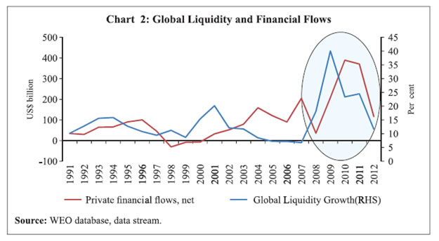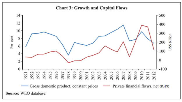 Amarendra Acharya and Anupam Prakash* The 2008 global financial crisis has brought the issue of global financial integration to the forefront. In the recent period, Asian economies have emerged as the new engines of growth. Many Asian economies have increasingly adopted outward oriented policies which have led to their progressive integration with the global economy. Furthermore, the outward oriented policies of many Asian economies are believed to have led them to a high growth path. This study examines the relationship between international financial integration (opening the economy both outwards and inwards) and economic growth in 11 Asian economies during 1991-2010. The approaches adopted in this paper are both analytical as well as empirical. The results of the empirical analysis indicate that evidence on the impact of international financial integration on growth is mixed. However, at a more disaggregated level, the analysis supports positive effects of the total capital inflows on growth; this holds true for both direct investment and portfolio flows. JEL Classification: D53, O11 Keywords: International Financial Integration, Financial Vulnerability Introduction Asia has witnessed rapid growth over the past few decades. Asian growth remained resilient even during the global financial crisis. The outward oriented policies of many Asian countries brought high growth and in the process helped in pulling many people out of poverty in these economies. In this context, the role of international financial integration (IFI) in the growth process has become a subject of passionate debate, particularly at a time when the global financial crisis is creating doubt about its benefits. This topic is assuming enormous importance, particularly for those Asian countries which are still in the early stages of development and the timing and pace for further opening up of their economies is expected to decide the fate of billions of people residing in this part of the world. When exchange controls are removed and entry barriers are brought down financial resources flow from one country to another. This brings about international integration of financial markets. Financial markets all over the world are also getting integrated due to advances in information technology, deregulation and globalization. Application of international best practices in macro-prudential regulations with competitive pricing of products has also added to the integration process (RBI 2007). The IFI of an economy generates some positive effects. However, the benefits of global integration are dependent on size, composition and quality of capital flows (RBI 2007). Further, it generates benefits like international risk sharing, meeting the domestic saving-investment gap and maintaining macroeconomic discipline (Agenor 2001). In addition, IFI helps in increasing factor productivity, increasing the efficiency of the financial intermediation process and lowering the cost of investments (Levine 1996, 2001, Capiro and Honhan 1999). The removal of entry barriers brings in new players and promotes competition at the global level. It reduces the cost of funds and financial services. Liberalized markets allow a capital scarce country to search for capital outside its border to finance its investment activities. Availability of different financial sources reduces not only funding costs but also the fund availability risk for a borrower. For international investors availability of various risk instruments improves the risk return profile. It brings in new financial techniques and products. It also forces financial intermediaries to go for innovation and be competitive. Greater market integration has increased competition and streamlined restrictions and increased the liquidity of markets. Access to world capital markets increases opportunities for portfolio diversification for investors and increases the potential for higher risks-adjusted rates of return. It also allows countries to borrow to smooth consumption in the face of adverse shocks, while the potential growth and welfare gains resulting from risk sharing can be large (Obstfeld 1994). Despite various economic crises, developing countries have moved towards financial openness as it has many economic benefits. Reforms which are needed to make economies safe in the face of international financial flows also help in curtailing vested interests and allow the economy’s productive potential to be fully achieved. There is empirical record that benefits are likely when reforms are implemented in a phased manner and complemented by policies to enhance stability and growth (Obstfeld 2009). The IFI of economies, however, also poses numerous challenges. While excessive capital inflows lead to an appreciation of the local currency, outflow of capital triggers panic in financial markets and makes the operation of the economic policies hostage to it. The growth of Asian economies, particularly those in South East Asia, was hampered by the south-east Asian currency crisis of 1997. A year before the crisis, five Asian economies (Korea, Indonesia, Malaysia, Thailand and the Philippines) witnessed US$93 billion of net private capital inflows; but one year after that they witnessed an outflow of around US$12 billion. The turnaround of outflow amounting to more than US$105 billion put these economies in severe economic crisis (Rodrik 1998). The financial crisis in advanced economies (AEs) was transmitted to other parts of the world inter alia due to financial linkages. In 2013, the financial markets of the major emerging market economies (EMEs) witnessed much volatility after a statement made by former Fed Chairman Ben Bernanke (on 22 May 2013) about the likely tapering of monetary expansion. This was associated with the spill-over of volatility across economies. Later, volatility returned to the financial markets in the second half of January 2014 when equities fell, spreads rose and currencies deprec