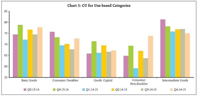 This annual article, third in the series1, presents the findings of quarterly Order Books, Inventories and Capacity Utilisation Survey (OBICUS) of manufacturing sector companies, conducted during October 2013 to March 2015 (covering 24th to 29th rounds). Average new orders of sample companies grew substantially during the reference period till Q2:2014-15 but went into contraction mode thereafter. The average raw material (RM) inventory to sales ratio and the average finished goods (FG) inventory to sales ratio fluctuated in the range of 22-25 per cent and 17-19 per cent respectively during the period. Both the ratios rose in Q4:2014-15 from the previous quarter and stood at higher levels, as compared to the position a year ago. Poor demand conditions were also reflected in the lower capacity utilisation (CU) in Q3:2014-15. The CU rose by more than 3 percentage points to 75.2 per cent in Q4:2014-15, partly due to seasonality coupled with pick up in the production of consumer non-durable items. I. Introduction: The Reserve Bank of India tracks several macroeconomic variables to assess the aggregate demand-supply position in the economy and formulates its monetary policy stance accordingly. Data on sales and profit margin of the manufacturing sector, an important segment of the economy, are available as part of the disclosures of such companies. However, information relating to order books, level of capacity utilisation and finished goods’ inventory level, which are also reflective of incipient demand conditions, are generally not readily available. To bridge this data gap, the Reserve Bank has been conducting Order Books, Inventories and Capacity Utilisation Survey (OBICUS) of Indian manufacturing companies on a quarterly basis since 2008. Results of the survey rounds are regularly disseminated on the RBI website. The sampling method used for OBICUS is purposive (non-random) and the companies have been empanelled to have a good size-mix of industries. The survey schedule is canvassed among a fixed panel of 2,500 manufacturing companies sector, which is common in many business tendency surveys. However, responding to the survey is voluntary and it has not been possible to obtain responses from all the companies and in all the quarters. The information collected in the survey includes quantitative data on new orders received during the reference quarter, backlog orders at the beginning of the quarter, pending orders at the end of the quarter, total inventories with breakup of work-in-progress (WiP) and finished goods (FG) inventories at the end of the quarter and item-wise production in terms of quantity and value during the quarter vis-à-vis the installed capacity from the targeted group. The level of capacity utilisation (CU) is estimated from the above data. In this article, position of order books, inventories and capacity utilisation of Indian manufacturing industry during October 2013 to March 2015 is based on the survey round 24 (pertaining to Q3:2013-14) to round 29 (pertaining to Q4:2014-15), with emphasis on latest estimates available for the respective quarters through different rounds. The related data tables are presented in Annex. II. Findings of Survey: II.1 Order Books Growth Average new orders of sample companies grew by more than 12 per cent in Q3:2013-14 on a year-on-year (y-o-y) basis and this high growth phase continued till Q2:2014-15. However, the position could not be sustained as new orders growth contracted in H2:2014-15 tracking falling sale volumes of the companies. On a quarter-on-quarter (q-o-q) basis, new orders growth fluctuated between marginal contraction and expansion in FY:2014-15. The q-o-q growth moved into the positive territory in Q4:2014-15 (Chart 1). II.2 Inventory to Sales Ratio During the period under reference, the average raw material (RM) inventory to sales ratio and the average finished goods (FG) inventory to sales ratio fluctuated in the range of 22-25 per cent and 17-19 per cent respectively. Moreover, the RM inventory to sales ratio remained lower on a y-o-y basis till Q3:2014-15. The FG and RM inventory to sales ratios rose in Q4:2014-15 from the previous quarter. Further, both these ratios stood at a higher level in Q4:2014-15, as compared to the position a year ago (Chart 2). II.3 Capacity Utilisation Level of capacity utilisation in the Indian manufacturing industry continued to show declining trend since 2011-12. Further, the average (4-quarter) CU in FY:2014-15 was lower (72.6 per cent) than that of FY:2013-14 (73.5 per cent). Reflecting seasonal movements, CU recorded high values in the last quarter of the financial year (FY) and found to fall in the subsequent quarter, i.e., Q1 of the following FY. CU picked up in Q4:2014-15 by more than 3 percentage points from its previous quarter, partly reflecting seasonality. After adjusting for seasonality, the CU at aggregate level rose marginally in Q4:2014-15 from Q3:2014-15 (Chart 3). The movements in CU remained broadly in line with the movements in the de-trended IIP for manufacturing sector (Chart 4). A further disaggregated analysis of CU for use-based categories indicates co-movement across all the categories except for the intermediate goods category, wherein it moved in the opposite direction in H2:2014-15. For both intermediate goods and basic goods categories, CU level remained above 70 per cent in all the quarters under the period of study. In Q4:2014-15, the rise in the CU at overall level from its previous quarter was largely driven by sharp rise in CU level in the consumer non-durables sector (63.7 per cent to 73.8 per cent). This is followed by the consumer durables (67.7 per cent to 72.6 per cent) and the basic goods (74.5 per cent to 77.7 per cent) segments. The average CU level of basic goods and intermediate goods remained higher at 75.3 per cent and 76.2 per cent respectively in FY:2014-15 as compared to other use-based categories, viz., consumer durables (70.0 per ce