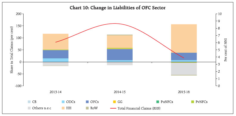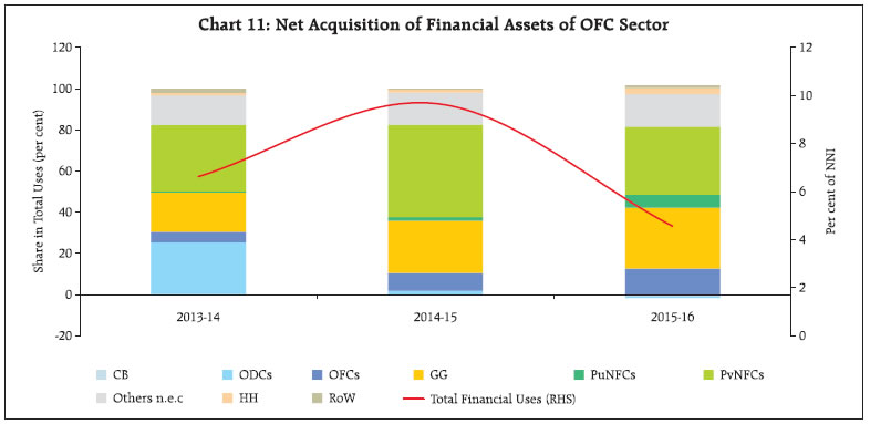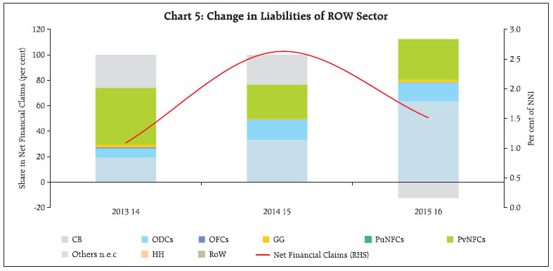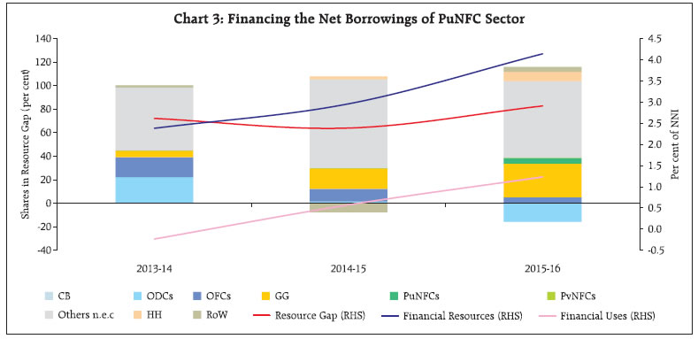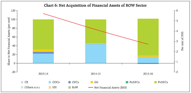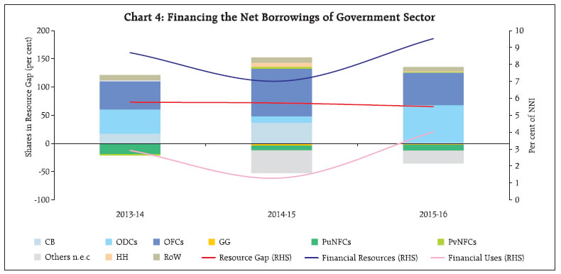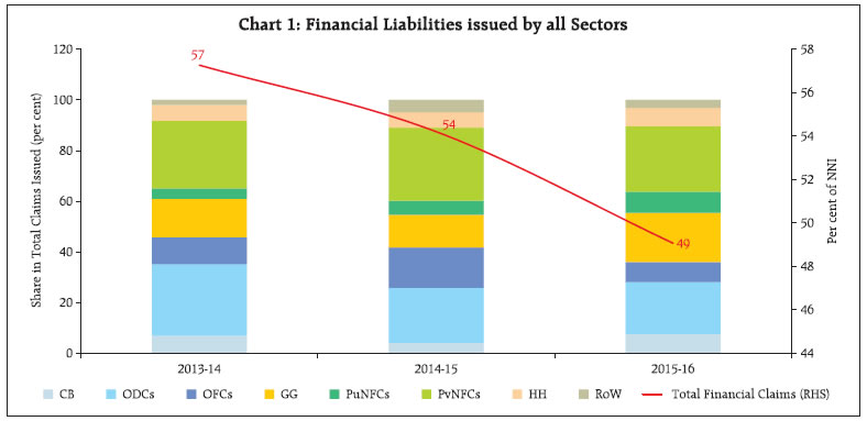 The financial resource gap of the economy narrowed further in 2015-16 in an environment characterised by benign commodity prices and moderation in capital formation. Currency and deposits gave way to ‘loans and borrowings’ as the most preferred financial instruments. Within the financial sector, liabilities of other depository corporations, which constitute mainly banks, declined mainly due to lower overall deposits. Non-bank financial corporations (NBFCs) grew in importance as suppliers of finance in the Indian economy. The financial surplus of the household sector continued to increase during the year. I. Introduction This article presents the flow of funds (FoF) accounts of the Indian economy for 2015-16 and updates for 2014-15 and 2013-14, which are consistent with the United Nations System of National Accounts (SNA) 20081. FoF accounts map instrument-wise financial flows across five major institutional sectors of the Indian economy on a ‘from-whom-to-whom’ basis. These institutional sectors2 comprise (i) financial corporations (FCs); (ii) non-financial corporation (NFCs) including in both public3 and private4 sectors; (iii) general government (GG) comprising both central and state governments5; (iv) the household (HH) sector; and (v) the rest of the world (RoW) (Exhibit 1). Financial instruments include currency, deposits, debt securities, loans and borrowings, equity, investment funds (such as mutual funds), insurance, pension and provident funds, monetary gold, other accounts (including trade debt) and other liabilities/ assets not elsewhere classified (Others n.e.c.). The rest of the article is organised into five sections. Section II presents the financial resource gaps across different sectors. Section III analyses movements in sectoral and instrument-wise FoF. Section IV highlights instrument-wise financial flows. Select indicators of financial development are presented and discussed in Section V. Concluding observations are set out in Section VI. II. Sectoral Financial Resource Gaps In the Indian economy, NFCs and GG constitute the major deficit sectors, while FCs and HHs are the major surplus sectors. The overall financial resource balance in the economy – measured by the net acquisition of financial assets less net increase in liabilities – as a proportion to net national income (NNI) at current market prices moved further into the surplus zone in 2015-16 from a marginal surplus in 2014-15, contrasting a deficit in 2013-14. This improvement was primarily driven by a reduction in net borrowings of non-financial corporations (NFCs), and a sustained improvement in net lending from the household sector as it shifted its portfolio from physical assets to financial assets albeit marginally (Table 1). While the NFCs increased their saving, benefitting from lower input costs due to decline in international commodity prices, financial corporations witnessed moderation in net lending owing to lower flow of credit from commercial banks and non-bank financial companies (NBFCs) as asset quality concerns mounted. Despite slippages at the sub-national level, the resource gap of the general government sector reduced marginally on account of fiscal consolidation by the central government. | Table 1: Sectoral Financial Resource Balance (per cent of Net National Income or NNI at current market prices) | | Components | 2013-14 | 2014-15 | 2015-16 | | 1 Non-Financial Corporations (NFCs) | -6.4 | -5.1 | -4.6 | | a. Public Non-Financial Corporations (PuNFCs) | -2.6 | -2.4 | -2.9 | | b. Private Non-Financial Corporations (PvNFCs) | -3.8 | -2.7 | -1.7 | | 2 Financial Corporations (FCs) | 2.6 | 2.5 | 1.8 | | 3 General Government (GG) | -5.8 | -5.7 | -5.5 | | 4 Household Sector (HH) | 8.4 | 8.4 | 9.0 | | 5 Total (1+2+3+4) | -1.2 | 0.1 | 0.7 | III. Sectoral Movements in Financial Flows6 In this section, movements in financial flows to the deficit sectors viz., NFCs and GG, are tracked followed by an analysis of flows from the surplus sectors i.e., the FCs and the HHs.7 The total acquisition of financial liabilities by all sectors (including the RoW sector) declined steadily from 2013-14 to 2015-16 (Chart 1). The financial liabilities of financial corporations declined from 26.2 per cent of NNI in 2013-14 to 22.7 per cent in 2014-15 and further to 17.7 per cent in 2015-16 on account of lower resource mobilisation by other depository corporations (ODCs) and other financial corporations (OFCs). Acquisition of financial liabilities by HH, on the other hand, increased, reflecting improved financial conditions. III.1 Non-Financial Corporations The share of financial liabilities of NFCs in total liabilities remained stable at around 34.2 per cent in 2015-16. III.1.a Private Non-Financial Corporations Operations of PvNFCs continued to benefit from benign global commodity prices in 2015-16. A slowdown in sales growth was offset by contraction in expenses on raw materials and components. Consequently, their operating profits soared and shrank the resource gap further from a year ago (Chart 2 and Statement 2.2). The declining role of banks in the financing of PvNFCs is reflective of the twin balance sheet problem - corporates and banks. The space created by ODCs was filled by other intra-sectoral flows. Furthermore, the role of RoW also waned, indicating lower role of external finance in the operations of PvNFCs on heightened risk perceptions relating to Indian corporates. As regards financial assets, the increase in equity flows of PvNFCs was substantial due to improved profitability. This could have led to higher investments in other non-financial firms, which experienced relatively lower investment demand than the previous year. III.1.b Public Non-Financial Corporations8 The financial resource gap of PuNFCs widened on account of lower retained profits as net revenues of these entities continued to shrink. Reflecting this, the overall borrowings of central public enterprises increased - despite a d