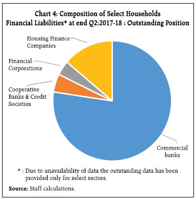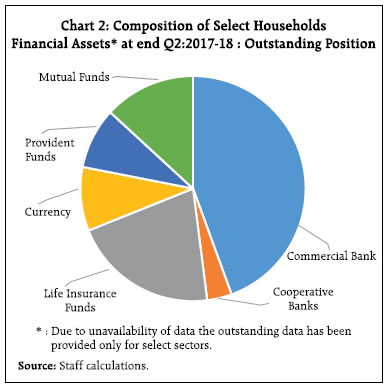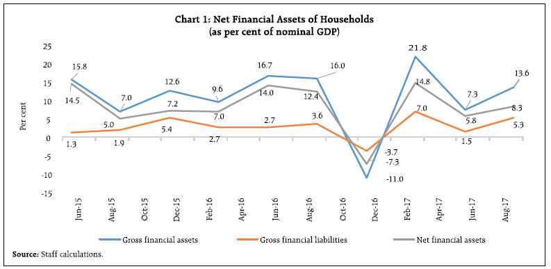Household sector is net financial surplus sector in the economy. Availability of higher frequency information about financial health of this sector is, therefore, crucial for assessment of macroeconomic conditions of the Indian economy. Present article is an attempt to generate preliminary estimates of financial assets and liabilities of the household sector on a quarterly basis. Results indicate that financial assets of the Indian households are predominantly in the form of bank deposits followed by life insurance. On the liability side too, commercial banks are the largest source of credit. Shift in the financial portfolio of the sector was observed in Q3:2016-17 in the wake of demonetisation. I. Introduction Households play a vital role in the functioning of an economy as factors of production, as consumers, and as a source of financing for investment through saving. Accordingly, financial conditions of households assume crucial importance in the context of overall financial stability. The Financial Stability Report of the Reserve Bank of India (RBI) conducts a bi-annual systemic risk survey, for which financial saving of households is a crucial variable under the macroeconomic risks category. Data on annual household saving are published by the Central Statistics Office (CSO) in its end-January release titled ‘First Revised Estimates (FRE) of National Income, Consumption Expenditure, Saving and Capital Formation’, and revised in the subsequent annual releases. Information on financial assets and liabilities of the household sector are also available in the Flow of Funds (FoF) Accounts of the Indian Economy1 published annually by the RBI on a ‘from-whom-to-whom’ basis consistent with the United Nations System of National Accounts (SNA) 2008. In terms of the FoF, households are traditionally a financial surplus sector and based on the FoF compilations, the RBI has been publishing preliminary estimates of annual household financial saving in its Annual Report, five months ahead of the CSO release. Higher frequency information on this critical variable is desirable to support a closer assessment of macroeconomic conditions, especially in identifying the sectoral linkages, spillovers, and in tracing the transmission of potential shocks across sectors. This is the first release of quarterly data on household financial assets and liabilities, as a precursor to our endeavour to move towards quarterly compilation of FoF accounts. This article presents a mapping of financial assets and liabilities of the household sector on a quarterly basis following the FoF approach for the period Q1:2015-16 to Q2:2017-18. The rest of the article is divided into two sections. Section II discusses preliminary estimates of quarterly financial assets and liabilities of the household sector at the aggregate level. Section III presents instrument wise developments. Section IV concludes. The methodology and data sources, as well as a tabular presentation of instrument-wise estimates of household financial assets and liabilities are given in the Annex. II. Financial Assets and Liabilities of Households The household sector holds its financial assets mainly in the form of currency, deposits, investments in debt securities, equities, mutual fund units, insurance and pension funds, and small savings. Liabilities are mostly in the form of loans and borrowings from banks, housing finance companies (HFCs) and nonbanking financial corporations (NBFCs). | Table 1: Households Financial Assets and Liabilities | | (Amount in ₹ billion) | | | 2015-16 | 2016-17 | 2017-18 | | | Q1 | Q2 | Q3 | Q4 | Q1 | Q2 | Q3 | Q4 | Q1 | Q2 | | Net Financial Assets (A-B) | 4,689.1 | 1,685.0 | 2,507.8 | 2,568.4 | 5,037.3 | 4,593.4 | -2,812.4 | 6,061.3 | 2,289.0 | 3,403.9 | | | 14.5 | 5.0 | 7.2 | 7.0 | 14.0 | 12.4 | -7.3 | 14.8 | 5.8 | 8.3 | | A. Gross Financial Assets | 5,109.9 | 2,337.8 | 4,374.3 | 3,555.0 | 6,026.2 | 5,948.1 | -4,245.7 | 8,912.7 | 2,874.9 | 5,578.5 | | | 15.8 | 7.0 | 12.6 | 9.6 | 16.7 | 16.0 | -11.0 | 21.8 | 7.3 | 13.6 | | B. Financial Liabilities | 420.7 | 652.9 | 1,866.5 | 986.6 | 988.9 | 1,354.7 | -1,433.3 | 2,851.4 | 585.9 | 2,174.5 | | | 1.3 | 1.9 | 5.4 | 2.7 | 2.7 | 3.6 | -3.7 | 7.0 | 1.5 | 5.3 | | Memo item: | | GDP | 32,416.9 | 33,540.9 | 34,749.3 | 36,933.2 | 35,984.9 | 37,153.5 | 38,502.7 | 40,896.1 | 39,297.3 | 40,882.9 | Note : Figures in italics are as per cent to GDP. Source: Staff calculations and CSO. | Indian households are generally net savers and suppliers of financial resources for the rest of the economy. However, net financial assets2 of the households turned negative (-7.3 per cent of gross domestic product (GDP)) in the third quarter of 2016-17, reflecting the transitory effects of demonetisation3. With subsequent remonetisation, the household sector’s net financial assets turned around and in the fourth quarter they amounted to 14.8 per cent of GDP. In 2017-18, net financial assets of households are estimated at 8.3 per cent of GDP in Q2, up from 5.8 per cent of GDP in Q1 (Table 1). The quarterly rate of net financial assets displays a high degree of volatility revealing the shifts in preferences of households for the various instruments on both the assets and liabilities side, which usually does not get captured in the annual data (Chart 1). III. Instruments of Households Financial Assets and Liabilities Outstanding financial assets4 of households in select instruments, namely, currency, bank deposits, life insurance funds, mutual funds, pension and provident funds display some interesting trend (Annex II: Table 3). Deposits with banks have remained the major form of financial assets, with the share of outstanding deposits with commercial banks being the highest, followed by insurance funds and currency, at the end of Q2: 2017-18 (Chart 2). Aggregate deposits with banks and non-banks increased in Q2:2016-17 to 8.6 per cent of GDP from 8.1 per cent in the previous quarter, possibly reflecti