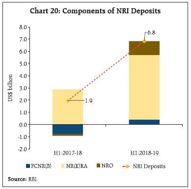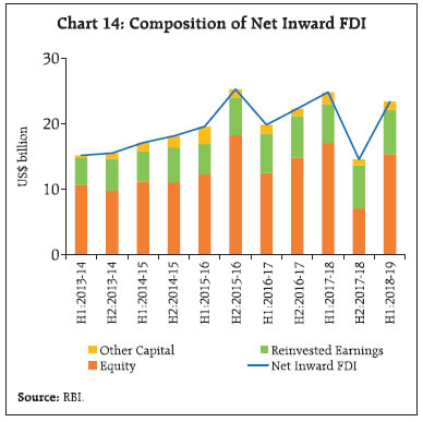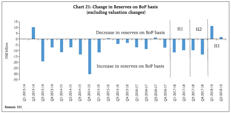 Global headwinds placed India’s balance of payments under pressure in H1:2018-19. While the impact of sharp rise in oil prices was discernible in widening of the current account deficit (CAD), policy tightening by the US Federal Reserve and strengthening of the US dollar led to massive FPI outflows. As the CAD exceeded net financial flows, there was a drawdown of reserves. Estimates suggest that CAD in H1:2018-19 was higher than the sustainable level. The Indian rupee, too, came under pressure and depreciated in both nominal and real effective terms. Introduction The first half of 2018-19 (i.e., April-September or H1) was marked by significant shifts in the global economic environment. Impulses of global growth peaked and appears to be weakening across several geographies. Even as external demand shed some of the robust momentum achieved a year ago, intensifying trade wars took their toll and with the maturing of the cyclical upturn that had commenced in mid-2016, the global trade slumped to 13 month low in August 2018. Meanwhile, staccato spikes in international crude prices in January and May solidified into a surge that took them to a 47 month high by early October. For net energy importers like India, this translated into sizable increases in oil import bills with adverse implications for their current account balances. India’s domestic coal shortages in the power sector were met through imports. Furthermore, a number of import items were subject to higher tariffs either to reduce dependence on imports or boost domestic industry. Global financial conditions tightened for emerging market economies (EMEs) across the board as a combination of interest increases and the ongoing balance sheet normalisation by the US Fed, geo-political tensions and EME-specific ‘left tail’ events spread risk aversion, resulting in massive portfolio outflows from their capital markets. In these turbulent global conditions, the Indian capital market was no exception and faced sizable FPI outflows in H1:2018-19 despite the increase in the investment limit and easing of norms relating to minimum residual maturity requirements and security-wise limits in the debt market. This article seeks to mirror these global and domestic developments in an analytical exposition of balance of payments (BoP) outcomes in H1:2018-19. It attempts to focus on specific factors that shaped health of India’s external sector during the period in the Indian economy’s interface with a challenging global environment and the key forces that can impinge on external sector stability going forward. The rest of the article is divided into four sections. Section II provides a detailed analysis of various components of the current account. Section III discusses external financing patterns through major functional categories of the capital and financial accounts. Section IV discusses BoP analytics from the perspective of the sustainability of external debt and the net international investment position. Section V discusses movements in effective exchange rates of the rupee and Section VI concludes by highlighting the potential balance of risks around the evolution of India’s BoP. II. Current Account The current account covers all transactions that directly satisfy economic needs and are distinguished as goods and services trade, receipt or payment of income from investments (primary income), and unilateral transfers (secondary income). By the national accounting identity, current account is definitionally equal to the net inflow of resources into the economy from abroad and the mirror image of the gap between gross domestic saving and investment. Historically, India has run a current account deficit (CAD), largely driven by merchandise (goods) trade deficit and partly offset by net exports of services and net receipts in the secondary income (transfers) account. In H1:2018-19, India’s CAD at US$ 35.1 billion surged to a four year high of 2.7 per cent of GDP (2.4 per cent in Q1 and 2.9 per cent in Q2 of 2018-19) from 1.8 per cent a year ago. As this section points out, this reflected a burgeoning trade deficit and higher net outgoes of primary income. Buoyant net export of services and remittances partly offset the impact (Chart 1a and 1b).  II.1 Transactions in Goods Cross-border transactions in goods and services are outcomes of production activities (IMF, 2010). With India being a net importer of goods from the rest of the world, the merchandise trade balance has been a major factor in determining the viability of India’s BoP over the years. It is in this context that the sharp widening of the trade deficit in H1:2018-19 under the brunt of surge in international crude oil prices emerges as a distinguishing feature against the backdrop of recent BoP developments, with implications for the CAD and its financing. On the exports side, India’s shipments picked up – both sequentially and on a year-on-year (y-o-y) basis – in H1:2018-19 notwithstanding the slowdown in global trade. Information compiled by the Directorate General of Commercial Intelligence and Statistics (DGCI&S) indicates that the improvement was led by non-oil sectors, viz., engineering goods, chemicals and drugs and pharmaceuticals. Exports of petroleum products expanded too, supported by higher international crude oil prices. Shipments from these four sectors together contributed 84 per cent of total export growth. Among the major destinations, the United States (US), the United Arab Emirates (UAE), China, Hong Kong and Singapore absorbed 37.4 per cent of India’s exports in H1:2018-19. Import growth was robust attesting to the underlying strength of domestic demand and was mainly driven by petroleum (crude and products), coal, electronic goods, machinery and chemicals. Higher imports of petroleum and coal essentially reflected elevated international prices. India’s goods trade deficit turns out to be highly correlated with trends in international crude o