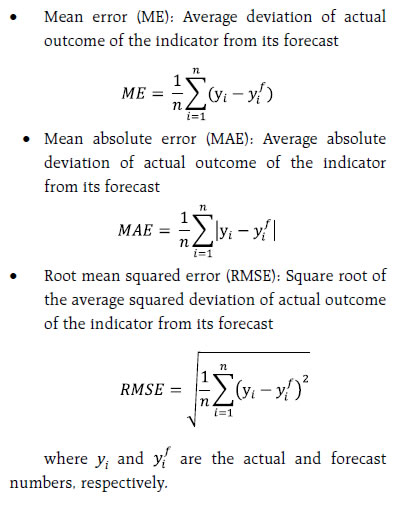 In case of exclusion based CPI inflation, the disagreement in one-quarter ahead forecasts remained mostly below the average level, except for few quarters in the recent period, where sudden spikes were observed (Chart 3). Inflation uncertainty measures for the quarterly forecasts declined for the first two quarters of 2019-20 since the November 2018 round (55th round) (Chart 4, left panel). In case of real GDP growth for 2019-20, uncertainty remained almost stable since the May 2019 round (58th round), while for 2020-21, uncertainty witnessed an uptick in the last round of the survey. VI. Conclusion Professional forecasters regularly monitor evolving macro-economic conditions and their expectations provide valuable input in forming the near-term and medium-term economic outlook. In the Reserve Bank’s regular survey, forecasters revised down their growth and inflation projections in successive survey rounds in the recent period. Forecasts of both output growth and inflation for 2018-19 and 2019-20 have been revised down. For the exclusion based CPI inflation, the forecast path was gradually revised up for 2018-19 but was lowered for 2019-20. Though the forecasters have revised both headline CPI inflation and exclusion based CPI inflation, the magnitude of forecast errors were of lower order in case of latter, reflecting relatively stable nature of exclusion based CPI inflation. The downward revisions in exclusion based CPI inflation forecaster for 2019-20 were in consonance with the downward revisions in growth forecasts. For 2018-19, the forecasts for CPI headline inflation and GDP growth had positive bias. Also, the disagreement on inflation forecasts has reduced in the recent period, coinciding with the moderation in the inflation volatility, particularly after 2017. Empirical analysis shows that the forecasts were generally efficient in terms of incorporating available information and there has been more agreement on growth and headline inflation outlook among the forecasters in the recent period. Further, the accuracy of forecasts improved as the forecast horizon narrowed. References Abel Joshua, Rich Robert, Song Joseph and Tracy Joseph (2016), ‘The Measurement and Behavior of Uncertainty: Evidence from the ECB Survey of Professional Forecasters’, Journal of Applied Econometrics 31: 533–550. Croushore Dean (1993), ‘Introducing: The Survey of Professional Forecasters’, Business Review, Issue November, 3-15. Raj Janak, Kapur Muneesh, Das Praggya, George Asish Thomas, Wahi Garima and Kumar Pawan (2019), ‘Inflation Forecasts: Recent Experience in India and a Cross-country Assessment’, Reserve Bank of India Mint Street Memo, 05/2019. RBI Data Release of Survey of Professional Forecasters (various issues). (https://www.rbi.org.in/Scripts/BimonthlyPublications.aspx?head=Survey%20of%20 Professional%20Forecasters%20-%20Bi-monthly) Zarnowitz Victor and Lambros Louis A (1987), ‘Consensus and uncertainty in economic prediction’, Journal of Political Economy 95: 591–621. |