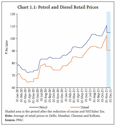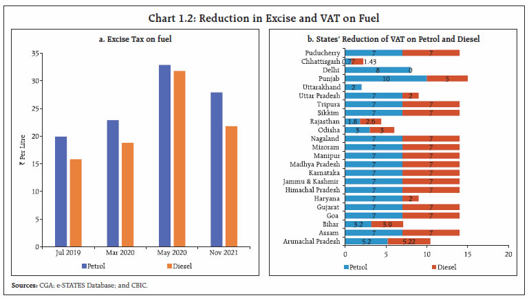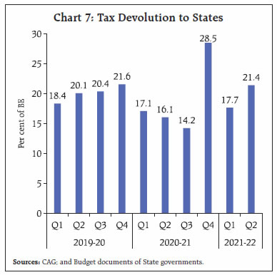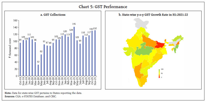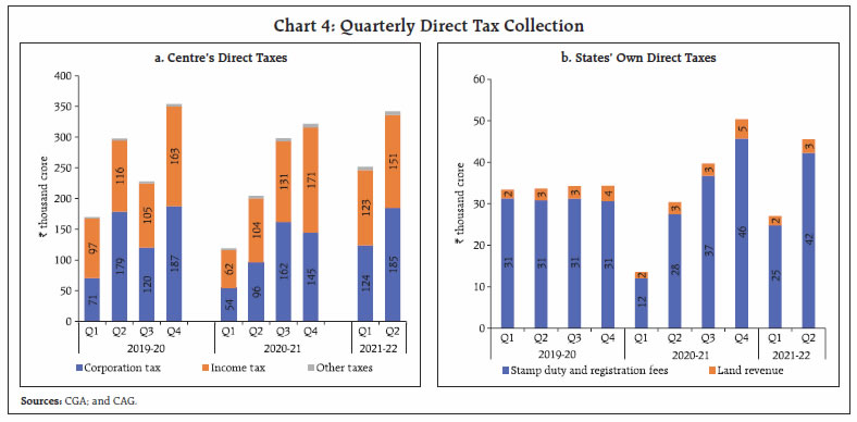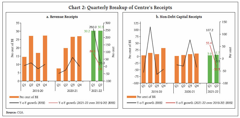 Government finances exhibited remarkable resilience to the second wave, with tax collections surpassing expectations, and government expenditure remaining broadly in line with the budget estimates despite higher pandemic related spending. There has also been a marked improvement in the quality of expenditure for both Centre and States, which bodes well for a durable growth revival. Going forward, the general government fiscal deficit, which remained subdued in H1:2021-22, allows space for a pick-up in expenditure in the second half of the current fiscal year to support and sustain the recovery in growth. I. Introduction The Union Budget for 2021-22 was presented at a juncture when the economy was witnessing a robust stimulus-led recovery from the severest recession encountered after the first wave of the pandemic, but amid lingering uncertainty about the prospect of a second wave. Accordingly, the Budget pursued a delicate balancing act, sustaining support to a broad-based and durable economic revival while aiming for feasible degree of fiscal consolidation in a challenging macroeconomic environment. The Budget envisaged a consolidation of gross fiscal deficit (GFD) from 9.5 per cent of GDP in 2020-21 (RE) to 6.8 per cent in 2021-22 (BE).1 States also budgeted for consolidation in their GFD from 4.7 per cent of GDP in 2020-21 (RE) to 3.7 per cent in 2021-22 (BE). The second wave, later during April-May 2021 turned out to be more severe in terms of loss of human lives, but the impact on economic activity was contained through localised restrictions and also better adaptation to live with the virus. Government finances showed remarkable resilience and buoyancy, and as a result, despite the additional expenditure burden imposed by the second wave, government spending has broadly remained in line with the budget estimates. The government’s thrust on capex resulted in a significant improvement in the quality of expenditure - a necessary condition for pro-growth fiscal consolidation in the medium-term. Centre’s tax collections surpassed expectations on the receipts side, with all major tax heads recording robust growth in the first half of 2021-22. States’ tax collections also exhibited strong growth, though not at the same pace as for the Centre, and have reached their pre-pandemic levels in H1:2021-22. The rest of the article is structured as follows: Section II analyses the receipt and expenditure outcomes for the Centre and States (at a quarterly frequency) for H1:2021-22. Section III deals with the outcomes in terms of key deficit indicators and their financing. Section IV presents estimates on general government finances for Q1 and Q2:2021-22 along with projections for the second half of 2021-22. Section V sets out the concluding observations and the near-term fiscal outlook. II. Fiscal Outcomes in Q1 and Q2: 2021-22 Total receipts of the Central government registered a marked improvement over its trend level and total expenditure remained contained in H1:2021-22, despite additional expenditure necessitated by the second wave as the government took precautionary measures to curtail avoidable expenditure. State finances also recovered to their pre-pandemic level in H1:2021-22. States collected 46.9 per cent of their budgeted receipts which is higher than the corresponding figures for the past three years2. On the expenditure side, the H1:2021-22 outgo was 37.8 per cent of the budgeted target, broadly in line with the average during the pre-pandemic years (Chart 1). a. Receipts Revenue receipts of the Central government registered a robust growth in Q1:2021-223, as tax revenues recorded high buoyancy despite the second wave and non-tax revenues received a boost from higher than budgeted dividend transfer from the Reserve Bank. With a 35.0 per cent growth in revenue receipts in Q2, it clocked a high of 60.4 per cent of BE in H1 as a whole. Non-debt capital receipts4 also improved in H1:2021-22 vis-à-vis H1:2020-21 but fell short of 2019-20 levels (Chart 2 a and b). States’ revenue receipts have also remained resilient to the second wave of the pandemic, with overall revenue receipts recording a y-o-y growth of 33.7 per cent in Q1:2021-22 over the previous year and 9.3 per cent over the corresponding quarter of 2019-20. Similar performance was sustained in Q2:2021-22 with the y-o-y growth in revenue being significantly high at 21.4 per cent. Overall, States’ revenue receipts in H1:2021-22 were 26.7 per cent higher than those in H1:2020-21 (8.2 per cent over H1:2019-20). Non-debt capital receipts of States also recorded high growth in both Q1 and Q2 of 2021-22 albeit with considerable volatility (Chart 3).  The Centre’s direct tax collections registered a y-o-y growth of 83.7 per cent in H1:2021-22, led by growth in income tax and corporation tax by 64.7 per cent and 105.1 per cent, respectively5, on the back of strong corporate performance. For States, stamp duties which account for more than 85 per cent of own direct tax revenues, more than doubled in Q1:2021-22; Q2 recorded a y-o-y growth of 53.4 per cent (Chart 4). The Centre’s indirect tax collections also increased during H1, led by a more than 100 per cent increase in customs duty collections on the back of improving trade activity and higher import demand. Union excise duty collections recorded an increase of 33.3 per cent over 2020-21 (79.0 per cent over 2019-20) during this period due to the higher duties levied last year (March and May 2020) to mobilise additional revenues as a pandemic induced emergency measure.   GST collections (Centre plus States) increased in H1 by 50.1 per cent and 12.5 per cent over 2020-21 and 2019-20 levels, respectively. GST revenues had taken a hit in May-June due to pandemic-related restrictions but recovered quickly thereafter, in line with the economic recovery and on account of steps taken by the tax administration to plug evasion and ease the compliance burden. In November 2021, GST c