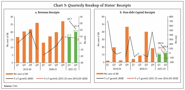 | Table 4: Quarterly Position of State Government Finances | | Item | (₹ thousand crore) | (Per cent) | | Actuals | Per cent of BE | Y-o-Y Growth Rate | | Q1 | Q2 | Q1 | Q2 | 2021-22 | | 2021-22 | 2020-21 | 2021-22 | 2020-21 | 2021-22 | 2020-21 | 2021-22 | 2020-21 | Q1 | Q2 | | (1) | (2) | (3) | (4) | (5) | (6) | (7) | (8) | (9) | (10) | (11) | | 1. Revenue Receipts | 535.5 | 400.6 | 638.8 | 526.1 | 16.8 | 13.0 | 20.0 | 17.1 | 33.7 | 21.4 | | 1.1. Tax Revenue | 378.4 | 262.4 | 475.1 | 389.6 | 17.4 | 12.0 | 21.9 | 17.9 | 44.2 | 21.9 | | 1.2. Non-Tax Revenue | 37.8 | 27.0 | 45.4 | 29.7 | 14.9 | 10.8 | 17.9 | 11.8 | 40.2 | 53.1 | | 1.3. Grants-in-aid and Contributions | 119.3 | 111.2 | 118.3 | 106.9 | 15.6 | 17.4 | 15.5 | 16.7 | 7.3 | 10.7 | | 2. Capital Receipts | 2.1 | 0.8 | 2.5 | 1.5 | 10.1 | 4.2 | 12.0 | 8.6 | 182.4 | 63.3 | | 2.1. Recovery of Loans and Advances | 2.1 | 0.7 | 2.4 | 1.5 | 14.6 | 5.2 | 16.9 | 10.6 | 186.9 | 61.6 | | 2.2. Other Receipts | 0.0 | 0.0 | 0.1 | 0.0 | 0.2 | 0.5 | 1.3 | 0.9 | -6.6 | 133.3 | | 3. Total Receipts | 537.7 | 401.3 | 641.3 | 527.6 | 16.7 | 13.0 | 20.0 | 17.1 | 34.0 | 21.5 | | 4. Revenue Expenditure | 625.2 | 563.6 | 697.0 | 608.2 | 18.7 | 18.1 | 20.9 | 19.5 | 10.9 | 14.6 | | 4.1. Interest Payments | 66.5 | 65.0 | 88.2 | 80.3 | 15.9 | 17.6 | 21.1 | 21.7 | 2.2 | 9.8 | | 5. Capital Expenditure | 78.0 | 39.3 | 107.7 | 68.3 | 12.0 | 6.9 | 16.6 | 11.9 | 98.5 | 57.9 | | 5.1. Capital Outlay | 68.9 | 36.6 | 102.3 | 60.8 | 11.6 | 6.9 | 17.2 | 11.5 | 88.3 | 68.3 | | 6. Total Expenditure | 703.2 | 602.9 | 804.8 | 676.5 | 17.6 | 16.4 | 20.2 | 18.4 | 16.6 | 19.0 | | 7. Revenue Deficit | 89.7 | 163.0 | 58.3 | 82.1 | 59.2 | 398.7 | 38.5 | 200.8 | -45.0 | -29.0 | | 8. Fiscal Deficit (6-3) | 165.5 | 201.6 | 163.5 | 148.8 | 21.2 | 33.8 | 21.0 | 25.0 | -17.9 | 9.8 | 9. Gross Primary Deficit (8 - 4.1) | 99.1 | 136.6 | 75.3 | 68.5 | 27.4 | 60.5 | 20.8 | 30.3 | -27.5 | 9.9 | Note: Data pertains to 26 States. Source: Comptroller and Auditor General of India. |