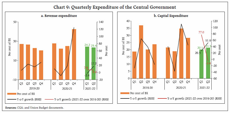 Tax devolution to States witnessed a y-o-y decline of around 12 per cent for Q1:2021-22. As a per cent of States’ budget estimates, however, the transfers were broadly in line with those in 2020-21 and 2019-20. For Q2:2021-22, the transfers were 13.3 per cent higher than the corresponding period of previous year and as a per cent of states’ budget estimates they were also higher than those in Q2 of previous two years (Chart 7). b. Expenditure The Centre announced a fiscal package of ₹6.3 lakh crore in June 2021 in response to the second wave, which included inter alia extension of free provisions of foodgrains under the Pradhan Mantri Garib Kalyan Anna Yojana (PMGKAY) until November8, enhanced fertiliser subsidy necessitated by the impact of increase in international prices of fertilisers, measures to strengthen public health, and loan guarantee schemes for COVID affected sectors. While some of these measures led to an additional expenditure over and above the budgeted amount, a large part was in the form of liquidity support and did not entail any additional fiscal burden. Subsequently, the first supplementary demand for grants, introduced in July 2021, proposed additional expenditure measures resulting in net cash outgo of ₹23,675 crore. The government also took precautionary steps to limit spending through expenditure curbs on various Central ministries and departments in Q2: 2021-22 (these expenditure limits have been relaxed with effect from September 24, 2021). As a result, despite pandemic related expansionary measures, total expenditure remained contained at 46.7 per cent of BE during H1:2021-22, as against 48.6 per cent and 53.4 per cent during first half of 2020-21 and 2019-20, respectively.  Going forward, an expenditure pick up is expected in H2:2021-22, on the back of the second batch of supplementary demand for grants that has proposed net cash outgo of ₹2.99 lakh crore – ₹2.33 lakh crore on revenue expenditure and ₹0.66 lakh crore on capital expenditure. The first and second supplementary demand for grants together entail an increase of ₹3.23 lakh crore over budget estimates, which translates into a 7.3 per cent increase in total expenditure in H2:2021-22 over H2: 2020-21 and 82.0 per cent increase over H2: 2019-20 (Chart 8). Higher revenue expenditure in Q2, led to an overall increase of 6.3 per cent in H1. Revenue expenditure had contracted by 2.4 per cent in Q1:2021-22 over the previous year (though higher by 7.8 per cent over Q1:2019-20), partly on account of a high base in Q1:2020-21 when expenditure had to be frontloaded and also expanded to deal with the first wave of the pandemic. The expenditure focus was strategically tilted towards capital expenditure, with a y-o-y increase of 38.3 per cent in H1 over 2020-21 (growth of 22.3 per cent over 2019-20) (Chart 9 a and b).