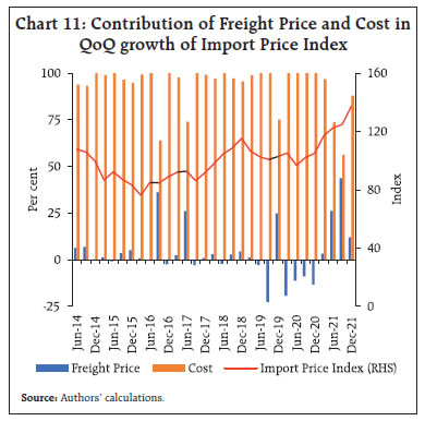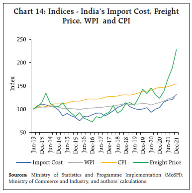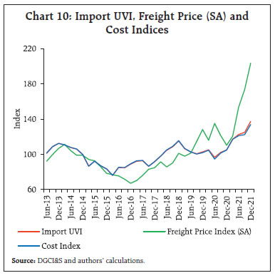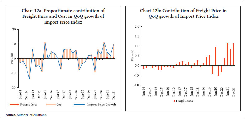 Global container shipping industry, a significant part of global supply chain logistics, came under severe pressure as world trade recovered from the collapse triggered by initial wave of the COVID-19 pandemic. Mirroring the global surge, freight charges in India have also been trending up and contributing to the rising value of India’s exports and imports in the recent quarters. The freight shocks emanating from container shortages and increased market frictions are found to have an impact on domestic retail prices, through import quantum and wholesale price channels under a structural vector autoregression (SVAR) framework. Higher freight also appear to exacerbate the passthrough of import cost shock to retail inflation. Introduction The world-wide restrictions triggered by coronavirus shock in 2020 led to significant collapse of international movements in goods and labour. The pandemic struck when global trade was already facing heightened uncertainties in the wake of Brexit and US-China trade tensions, which had rendered freight capacity relatively stagnant and supply chains disrupted (Patra et. al., 2022). Also, no significant new capacities could have been added during the early waves of the pandemic. The container shipping industry that caters to transport of the traded goods and forms a significant part of global supply chain logistics, came under severe pressure when the world trade recovered swiftly, particularly from sharp acceleration in exports from East Asia, Pacific and China, which reflected in the surge in freight cost across all transoceanic trade routes. In this context, this study looks at international trade in India that rebounded from the initial impact of the pandemic and has now surpassed the pre- COVID-19 average levels and analyses the contribution of freight in imports and exports values, using unit value and quantum indices as well as by constructing quarterly price indices for India, separately for freight and import cost based on the freight to trade ratios as derived components from its balance of payments (BOP) statistics. In view of the greater role of freight price1 in import and export prices in the recent period, it also examines the role of freight in inflation dynamics in India. The interconnected nature of global trade passed through the terrains of both risk and resilience during the pandemic which reflected in its contraction and rebound, aided by initial hindrances and later supply responses. Interruptions to international trade including lower activity or suspension of services on some routes in view of sinking demand and heavy restrictions, led to the congestions at ports, as shipping containers that usually move back and forth, got concentrated at few ports (UNCTAD, 2020). The constrained capacity management by carriers amid swiftly dropping container inventory caused market frictions (viz., long delays at ports, backlog of product waiting to be delivered/cleared/loaded adding to the congestion and leading further to container unavailability). These market frictions were further aggravated by other underlying causes, including pandemic related labour shortages and changing trade patterns - surge in e-commerce, consumer spending shift from contact-intensive services to lockdown-initiated consumer durables and health related supplies, that added more pressure to the shipping costs (Kamali, 2022). The low recycling of empty containers on longer trade routes amid restrictions contributed to their global shortages, which in turn contributed to higher premiums/leasing rates on new containers (UNICEF, 2021).  Such increased market frictions led to manifold increase in the global container freight costs at the time when shipping industry was already struggling to meet the surging demand, more notably from China, which recovered sooner from the pandemic vis-à-vis other regions and contributed substantially to the rebound in trade, given its strong position in global trade and its being a dominant container manufacturer (Attinasi et. al., 2021). The market driven shipping costs, as reflected in Freightos Baltic Global Container Index (FBX)2, has been recording over 100 per cent annual growth consistently since late 2020, indicating sustained high pressure (Chart 1). The spikes reflect the strong demand and faster than expected recovery in global trade (Chart 2). Prices of shipping containers and container freight rates across all trade links spiralled up according to the Drewry world container index, which has remained at elevated levels after touching record peak during Sept-Oct 2021 (Chart 3). Reflecting the surge in global commodity prices and transport costs, inflation and inflation expectations in the Euro area and the US have risen substantially in the recent period (Charts 4a, 4b). In order to gauge the inflationary impact of the higher costs, OECD quantifies the pass-through of 50 per cent rise in shipping cost to consumer price inflation (via merchandise import price inflation) to around 0.2 percentage point after four quarters, given the relatively small portion of transport costs in the total goods value (Nefussi and Rusticelli, 2021). Another study looks at the impact of shipping cost on US inflation and estimates that 15 percent increase in shipping costs leads to 0.10 percentage point increase in core inflation after one year (Herriford et. al., 2016).   Based on a sample of 46 countries from February 1992 to December 2021, shipping cost is found to be closely affecting the inflation (Swallow et. al., 2022). The study concludes that a one standard deviation increase in global shipping costs typically increases domestic headline inflation by 0.15 percentage point over 12 months. Even as adverse impact of the pandemic waves is still lingering on the macro-economic conditions in different parts of the globe, the Russian invasion of Ukraine has come as another severe economic shock to the international trade, growth and the prices (OECD, 2