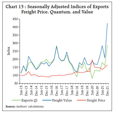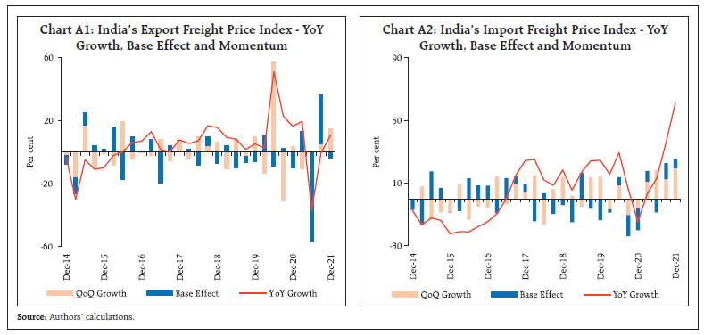 Annex | Table A1: Base Effects of Freight Price Index for India’s Exports and Imports | | Quarters | Freight Price Index for Exports | Freight Price Index for Imports | | Base Effect | Q-o-Q Growth | Difference in Y-o-Y Growth | Base Effect | Q-o-Q Growth | Difference in Y-o-Y Growth | | 2019-20:Q1 | -9.9 | 8.7 | -1.2 | 16.5 | -5.2 | 11.4 | | 2019-20:Q2 | -4.0 | -2.4 | -6.4 | -6.2 | 13.6 | 7.3 | | 2019-20:Q3 | -6.1 | 9.7 | 3.6 | -13.8 | 14.1 | 0.3 | | 2019-20:Q4 | 10.6 | -13.3 | -2.8 | -2.0 | -6.8 | -8.8 | | 2020-21:Q1 | -8.7 | 57.1 | 48.4 | 5.2 | 8.6 | 13.8 | | 2020-21:Q2 | 2.4 | -30.7 | -28.3 | -13.6 | -10.3 | -23.9 | | 2020-21:Q3 | -9.7 | 3.5 | -6.2 | -14.1 | -6.0 | -20.1 | | 2020-21:Q4 | 13.3 | -10.4 | 3.0 | 6.8 | 11.0 | 17.8 | | 2021-22:Q1 | -57.1 | 0.8 | -56.3 | -8.6 | 18.4 | 9.8 | | 2021-22:Q2 | 30.7 | 5.5 | 36.2 | 10.3 | 12.5 | 22.8 | | 2021-22:Q3 | -3.5 | 14.7 | 11.2 | 6.0 | 19.4 | 25.4 |