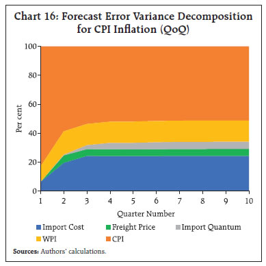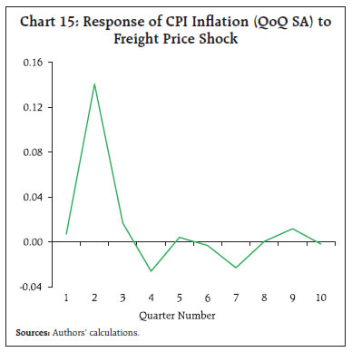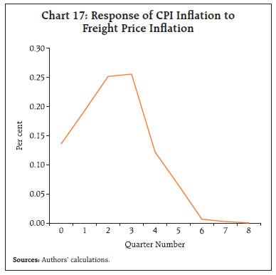 | Table A4: Response of Domestic Retail Inflation via Freight Price changes under SVAR Framework | | 10% shock to | Average Response of CPI Inflation (Y-o-Y) over next one year (in bps) | | A. Freight Price | 21 | | Channel 1: via Import Quantum and WPI | 10 | | Channel 2: via WPI | 25 | | B. Import Cost | 36 | | B1. Import Cost via Freight Price | 22 | | Channel 1: via Freight Price, WPI | 24 | | Channel 2: via Freight Price, Import Quantum and WPI | 17 | | B2. Import Cost via WPI | 30 | | All variables simultaneously | 58 |