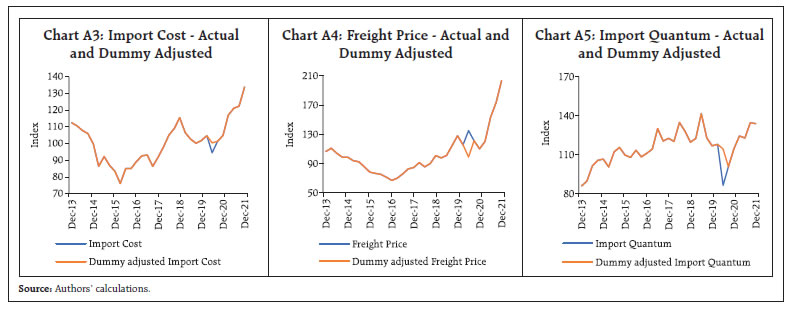 | Table A2: Average Seasonal Factors (Period: 2013-14 to 2020-21) | | Variable | Q1 | Q2 | Q3 | Q4 | | Imports Cost | 101.0 | 99.0 | 100.5 | 99.8 | | Freight Price | 97.2 | 97.1 | 98.6 | 106.9 | | Imports Quantum | 106.0 | 100.0 | 97.7 | 96.3 | | WPI | 100.1 | 100.5 | 100.3 | 99.2 | | CPI | 99.5 | 100.6 | 100.6 | 99.2 |