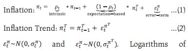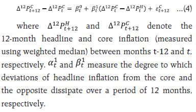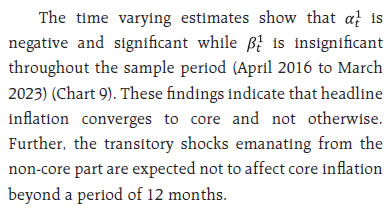 by Michael Debabrata Patra, Joice John and Asish Thomas George^ Examining properties such as persistence, anchoring, generalisation, convergence and cyclical sensitivity, this article finds that supply shocks during 2020-22 transited the Indian economy to a high inflation regime. Since the second half of 2022-23, there is a rising probability that inflation is transiting away from the high regime with a decline in persistence and trend, even as it is exhibiting increasing sensitivity to demand factors. The task of monetary policy is to guide the economy to a low inflation regime while being in readiness to address the rising sensitivity of inflation to demand pull. In India, inflation declined from double digits in the early 2010s and aligned with the legislatively mandated target of 4 per cent set under the flexible inflation targeting (FIT) framework over the period 2016 to 2019. The onset of the Covid-19 pandemic brought in lockdowns, massive urban-to-rural migrations and severe supply disruptions. Just as signs of waves of the pandemic abating become evident, the war in Ukraine since February 2022 reignited inflationary pressures catching central banks across the globe wrong footed by what seemed to be multiple supply shocks (supply chain disruptions; container shortages; port and shipping dislocations; war-induced evaporation of food, energy, fertilisers and metal supplies; sanctions and financial fragmentations) when incipiently a surge in pandemic-liberated demand was taking hold as it rotated away from contact-intensive services. Quickly inflation became global, stinging central banks into the most aggressive and synchronised monetary policy response in several decades. In India, inflation remained above the upper tolerance band, triggering statutory accountability procedures by November 2022. This article peers underneath the inflation prints to try to decipher why India was ambushed by these inflation regime shifts - the high inflation experience of 2020 and 2022, followed by signs of transition. It follows influential work on a two-regime view of inflation with focus on transitions (Borio, et al., 2023) to analyse the properties of those regimes in India after statistically identifying them in section II. We examine the behaviour of trend inflation, its persistence and stochastic volatility in order to examine the state of inflation expectations. Externalities associated with these regime changes in inflationary pressures, their generalisation tendencies and relative price dynamics are parsed in section III with a view to understanding the broad-based nature of inflation. Section IV revisits the convergence properties between core and headline so as to examine the durability of inflationary pressures. Section V investigates the cyclical sensitivity of inflation across regimes to evaluate the role of demand factors in the evolution of inflation. Section VI concludes with some policy perspectives. II. Regime Shifts in India’s Inflation History The Markov switching model (Hamilton,1989) is among the most popular nonlinear time series regime switching models in the literature. This model examines multiple structures that can depict inflation behaviour in different regimes, characterising the complex dynamic patterns switching between these structures. A Markov switching model applied on year-on-year (y-o-y) inflation rates in India from January 2012 to March 2023 reveals that with the de facto introduction of FIT in India in 2014, inflation shifted from a high regime in which it averaged over 8 per cent during 2012-14 to a lower regime averaging 4.4 per cent. With the outbreak of the Covid-19 pandemic in early 2020, inflation moved back to a high regime for a brief period. As the pandemic seemed to abate, inflation reverted to a low regime by early 2021 and remained there till the Ukraine war in early 2022 caused it to move back to a high regime during the first half of 2022-23. Since H2 of 2022-23 there is a rising probability that inflation is transiting away from the high regime (Chart 1).  In line with the seminal work on the subject (Stock and Watson, 2007 and Cogley, et al., 2010), we decompose inflation into two components – trend and cycle. Changes in the trend component are highly persistent, whereas shocks to the cyclical component are temporary. Equations (1) and (2) are estimated as time-varying parameter regressions with stochastic volatility (TVP-SV) wherein inflation is measured by seasonally adjusted month-on-month (m-o-m) annualised rate of the Consumer Price Index (CPI). We observe that the “intrinsic” element, which represents the persistence of inflation due to its own past or price-setting inertia, was high during 2011-13. It declined from 2014 and remained low through 2016 till 2019. After the Covid-19 shock in early 2020, inflation persistence started to increase till it peaked in April 2022. More recently, intrinsic inflation persistence seems to be on a declining trajectory (Chart 2). Equations (1) and (2) can also be utilised to filter out the unobserved trend in inflation in India. Trend inflation in India fell down from the peak during 2011-13 and remained range bound around the target during 2016-19. It started to increase after the onset of the pandemic, i.e. from early 2020, but it is found to be very gradually returning to the target (Chart 3).  Decomposing the variability in inflation into trend and cyclical components shows a marked increase in both components, post Covid-19 period. Overall, in all regimes inflation variability has been mainly driven by its cyclical component, indicating the role of supply shocks. The variability of the trend component of inflation, has declined from its highs during 2011-13 and remained modest till 2019, indicating that inflation expectations were getting anchored. After the Covid-19 shock, however, volatility in the cyclical component of inflation caused by supply also translated into an increase in the 