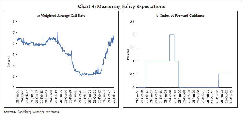 by Michael Debabrata Patra, Indranil Bhattacharyya and Joice John^ The role of monetary policy communication in the form of forward guidance in the tightening phase of the policy cycle is under close scrutiny. The results of an auto regressive conditional heteroscedastic (ARCH) model on overnight indexed swap rates indicate that forward guidance has a statistically significant impact on long-term interest rate expectations, but it progressively loses potency as the policy rate rises from highly accommodative levels. “…Communication comes with the cost of misinterpretation and also may limit flexibility. So I think we should use forward guidance sparingly when the course of policy is either reasonably well understood, or on the contrary, is so dependent on uncertain future developments that little really can be said constructively about the future.” – remarks by Jerome Powell, Chairman of the Federal Reserve of the United States (US), Panel Discussion, Thomas Laubach Research Conference, Washington, D. C. on May 19, 2023. Introduction The global financial crisis (GFC) brought about a paradigm shift in the manner in which monetary policy is communicated to the public. The monetary mystique or “constructive ambiguity”1 of the 1990s was jettisoned in favour of greater openness and clarity. Overwhelmingly, central banks chose to provide information about their view of the state of the economy and the likely future course of monetary policy. The term forward guidance gained currency worldwide. Central banks began to provide verbal assurance to the public about the intent of monetary policy going forward so as to anchor expectations to their stated goals and nudge the behaviour of the public in the direction they desired. This was a natural corollary to their encounter with the zero lower bound on interest rates – the glass floor below which it was believed that interest rates cannot fall. Forward guidance became recognised as an important instrument in the monetary policy toolkit – “monetary policy is 98 per cent talk, and only two per cent action” (Bernanke, 2015). The underlying belief has been that transparency instils credibility. The shock and awe of the pandemic overlapped by the war in Ukraine produced a surge of inflation across the world to heights last seen four decades ago. This inflation visitation has also turned out to be tenacious and broad-based, resisting one of the most aggressive and sychronised episodes of monetary policy tightening in recent global history – illustratively, policy rates have been increased since January 2022 in the range of 225-675 basis points (bps) in major advanced economies2 (AEs) and 75-5900 bps in major emerging market economies3 (EMEs) – accompanied by active balance sheet consolidation. More recently, as inflation has shown grudging signs of relenting, central banks have either tempered the size of rate increases or have paused only to find themselves in a twilight zone on communicating their future intentions to the public. In fact, a few central banks have recently resumed policy rate increases after pausing.4 These developments have brought the role of monetary policy communication, especially forward guidance, in the tightening phase of the policy cycle under close scrutiny. As central banks raised interest rates, they also engaged in hawkish forward guidance which unleashed bouts of high turbulence in global financial markets, amplified the tightening of financial conditions and triggered exodus of capital from the emerging world. Once again, the paradigm began to shift, with monetary policy communication seen as engendering risks to financial stability. With banking collapses in some jurisdictions, the view gaining ascendency is that financial stability considerations should be taken into account while formulating monetary policy and communicating it (Schnabel, 2023). Implicit in this view is that unlike the zero lower bound to interest rate cuts, there is no upper bound to interest rate increases, and a shrill pitch in forward guidance can be deeply destabilising. Discretion in forward guidance when monetary policy has to be formulated under heightened uncertainty is increasingly gaining advocacy over the value of hawkishness, as reflected in the influential view with which this paper began. In India, monetary policy communication has imbibed global best practices with country-specific adaptations. The decision of the monetary policy committee (MPC) on the policy rate and its underlying rationale along with forward guidance are conveyed to the public through a resolution on the day of the MPC’s meeting. This is backed up by a statement of the Governor, Reserve Bank of India (RBI), as the chairman of the MPC. In addition, press briefings, speeches, forward-looking surveys, research, minutes of the MPC meeting and a semi-annual monetary policy report are other avenues of conditioning expectations. In this context, however, there has been animated debate in the public domain in India about the relevance of forward guidance in conveying the future intent of monetary policy in a rate tightening cycle. The dilemma is sharpened by the public’s elation with recent small moderations in inflation and improvements in growth performance whereas the MPC remains focused on closing the wide gap between headline inflation and the target, and the relatively smaller gap between output and its potential. Addressing this dilemma is the main motivation of this paper. Employing an auto regressive conditional heteroscedastic (ARCH) model, we find that forward guidance communicated in the policy resolution has a statistically significant impact on long-term interest rate expectations, but it progressively loses potency as the policy rate rises from highly accommodative levels. The rest of the paper is organised, into three sections. The next section presents some stylised facts about recent monetary policy developments in India as reflec