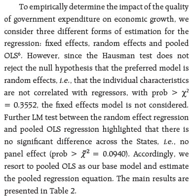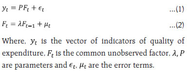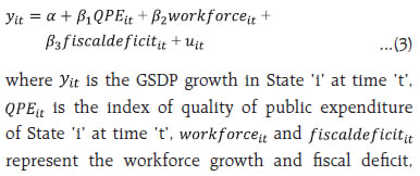 Controlling for the impact of workforce growth and fiscal deficit, we find that the index of quality of government expenditure has a positive (statistically significant) effect on GSDP growth, which could be due to the higher share of government capital expenditure or due to higher share of developmental expenditure such as education, health or research and development. The significant association between the share of government capital expenditure and economic growth has been noted in previous studies (Cashin, 1995; Bose et al., 2007). Government investment in capital goods is associated with higher rates of economic growth by increasing productivity, stimulating innovation and crowding-in private investment resulting in higher capital expenditure multipliers compared to revenue expenditure multipliers (Wahab, 2011). While capital expenditure multiplier is estimated to be well above unity for both the Union and State governments in India, revenue expenditure multiplier is found to be less than one as an increase in revenue expenditure has been associated with reduction in capital expenditure which affects private investment adversely and offsets the positive impact emerging from the consumption channel and ultimately increases the output by an amount less than one (Rath et al., 2023b; RBI, 2022). The positive impact of development expenditures such as higher share of education and health expenditure on growth has also been documented (Zhang et al., 2020; Kesavarajah, 2019; Bose et al., 2007). | Table 2: Regression Results | | Variables | Pooled OLS | Fixed Effects | Random Effects | | QPE (log) | 0.01*** | 0.02** | 0.01* | | | (0.00) | (0.01) | (0.00) | | Workforce Growth | -0.13*** | -0.13*** | -0.13*** | | | (0.04) | (0.05) | (0.05) | | Fiscal Deficit (log) | -0.01*** | -0.01*** | -0.01*** | | | (0.00) | (0.00) | (0.00) | | Constant | 0.12*** | 0.08** | 0.12*** | | | (0.02) | (0.04) | (0.02) | | Observations | 203 | 203 | 203 | Notes: (i) Conclusions are drawn based on the Pooled OLS model only; (ii) Standard errors are given in parentheses; (iii) *, ** and *** indicate significance at 10 per cent, 5 per cent and 1 per cent level, respectively. Source: Authors’ estimates. | VI. Conclusion With States accounting for around 60 per cent of general government expenditure and about 70 per cent of general government capital outlay (adjusted for defence spending), they have an important role to play in India’s growth story. This paper provides a composite measure of quality of public expenditure of Indian States using a dynamic factor model (DFM) which tracks the evolution of quality of public expenditure over the years. Further, the empirical analysis of the expenditure quality of select States over the period 2005-06 to 2019-20 shows that an improvement in expenditure quality of States is associated with higher GSDP growth, underlining the crucial role of States’ expenditure quality in realising higher growth. These results assume critical importance as there has been a distinct shift in the compositional pattern of State government expenditure in favour of capital expenditure since 2020-21. As against the 30-year average of States’ capital outlay at 1.9 per cent of GDP, their capital outlay is budgeted at 2.9 per cent of GDP in 2022-23 (BE), which bodes well for economic growth (RBI, 2023). The Central government has also been promoting capital expenditure at the sub-national level – it has extended the scheme for ‘Special Assistance to States for Capital Investment’ in 2023-24 with an enhanced allocation of ₹1.3 lakh crore. Under this scheme, the Centre has approved capital investment proposals of ₹56,415 crore in 16 States as of June 26, 2023. It has also been front-loading tax transfers to boost States capex – in 2022-23, the Centre released one extra instalment of devolution in August and another in November, as against the norm of releasing additional instalments towards the end of the year; in 2023-24, one advance instalment has already been released in June. If States manage to use the available fiscal headroom to step up productive expenditures, the beneficial impact on growth would ensue. References Adam, C., & Bevan, D. (2001), “Non-linear Effects of Fiscal Deficits on Growth in Developing Countries”, Department of Economics, University of Oxford. Adam, C. S., Bevan, D. L., Gupta, S., & Radelet, S. (2003), “Staying the Course: Maintaining Fiscal Control in Developing Countries [with Comments and Discussion]”, In Brookings trade forum (pp. 167-227). Brookings Institution Press, January. Alqadi, M & Ismail, S. (2019), “Government Spending and Economic Growth”, Journal of Global Economics. Banka, A. (2022), “Assessment of the Quality of State Expenditures in India”, Indian Economic Service, Government of India. Barrios, S & Schaechter, A. (2008), “The Quality of Public Finances and Economic Growth. Directorate General of Economic and Monetary Affairs. European Commission”, European Economy - Economic Papers. Behera, B. K., & Mallick, H. (2022), “Does Fiscal Deficit Matter for Economic Growth Performance of Indian States?: An Empirical Analysis”, Indian Public Policy Review, 3(6 (Nov-Dec)): 16-44. Bleaney, M., Gemmell, N., & Kneller, R. (2001), “Testing the Endogenous Growth Model: Public Expenditure, Taxation, and Growth over the Long run”, Canadian Journal of Economics, 34(1): 36-57.. Bose, S. & Bhanumurthy, N. (2015), “Fiscal Multipliers for India”, The Journal of Applied Economic Research. Bose, N., Haque, M. E., & Osborn, D. R. (2007), “Public Expenditure and Economic Growth: A Disaggregated Analysis for Developing Countries”, The Manchester School, 75(5): 533-556. Busatto, L. M. (2011), “The Quality of Public Expenditure and its Influence on Economic Growth: Evidence from the State of Rio Grande Do Sul”, Minerva Program, Spring 2011. Campodonico, B., Francisco, J., Cassinelli, P., & Mesones, J. (2014), “The Impact o
