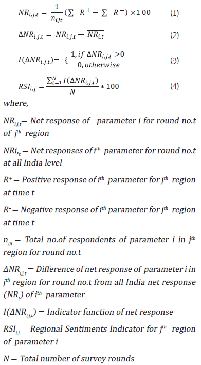 by Sourajyoti Sardar, Aditya Mishra, Manu Swarnkar, and Tushar B. Das^ The article explores regional variations in consumer confidence in India, analysing households’ sentiment across various survey parameters. The survey results indicate that sentiments vary across regions, with one region more optimistic about the current situation and another about the future. The analysis suggests that regional price pressures, income, and employment conditions shape the overall economic perspective, with this relationship becoming more pronounced during the pandemic. I. Introduction Consumer confidence surveys attempt at gauging household sector’s opinion on the overall economic conditions and the health of the economy from the perspective of consumers. The socioeconomic status of individuals plays a significant role in shaping their macroeconomic expectations and perceptions (Das, 2017). Variations in socioeconomic conditions among individuals can lead to significant differences in their outlook (Mankiw et al., 2003; Souleles, 2004; Puri and Robinson, 2007; Dominitz and Manski, 2007). In a vast country like India, regional differences can further contribute to this heterogeneity due to differences in their socioeconomic characteristics. Regional differences can arise from variations in per capita income, health and education standards, industrialisation levels, employment opportunities, infrastructure, and savings and consumption behaviour of households, among other factors. There is a strong correlation between consumer confidence and economic activity (Kilic and Cankaya, 2016). Consumer confidence data contain valuable lead information about economic conditions (Kumar et al., 2019). However, economic activity alone does not provide a comprehensive understanding of the factors influencing consumer confidence. Furthermore, local business cycles may not align perfectly with national cycles (Owyang et al., 2004), and consumer confidence can respond differently to changes in employment and consumption depending on geographic location (Guo, 2016). Ohlan (2012) found that the Southern region of India tends to have more balanced socioeconomic development compared to the Central and Northern regions, highlighting the importance of considering regional variations. The southern and western parts of India demonstrate higher degrees of industrialisation, evident in a larger concentration of factories despite having a lower proportion of the overall population (Chart B1 in Annex B). Additionally, these regions have a higher proportion of urban dwellers and significantly higher incomes. For instance, Karnataka, Kerala, and Tamil Nadu alone have a combined gross state domestic product (GSDP) higher than 13 eastern states, including the Northeast, as well as states like West Bengal, Odisha, Bihar, Jharkhand, and Andaman and Nicobar Islands1. Furthermore, the average regional consumer price indices (CPI-U) compiled using state-wise weights for urban areas also exhibit varying rates of inflation. This article employs qualitative information from the Consumer Confidence Survey (CCS) conducted by the Reserve Bank of India (RBI) to analyse regional variations in consumer sentiments in India. Introducing the newly designed “Regional Sentiment Indicator” (RSI), this study utilises qualitative data analysis methods, including coherence analysis and ordered logistic regression, to investigate variations in survey responses across different regions. Section II of this article offers an overview of both the data and the techniques employed in the study. The subsequent sections of the paper provide an overview of the regional variations in sentiments across various survey indicators (Section III), analyse the relationship between survey responses in different regions (Section IV), and study the regional patterns in the perception and outlook of the general economic situation (Section V). This section sheds further light on variations in sentiments among different occupation and income categories. Finally, the article concludes with the major findings and policy implications of the study (Section VI). II. Data and Methodology The CCS gathers information on households’ current perceptions compared to a year ago, along with their expectations for the year ahead on key macroeconomic indicators like the general economic condition, employment scenario, price level of the economy, as well as individual households’ income and spending. Respondents express their sentiments on these parameters on a three-point scale. Using these data, RBI compiles two consumer confidence indices: The Current Situation Index (CSI)2 and the Future Expectation Index (FEI). The respondent-level data of CCS, available in RBI’s Database on Indian Economy3, have been used for this article. Detailed survey description is provided in Annex A. Since March 2021, the consumer confidence survey has been conducted in 19 cities. However, to ensure a longer time series, 13 common cities are considered for this study. These cities are divided into 4 regions, viz., north (Delhi, Jaipur, and Lucknow), south (Bengaluru, Hyderabad, Chennai, and Thiruvananthapuram), east (Kolkata, Guwahati, and Patna) and west (Mumbai, Ahmedabad, and Bhopal) and have been surveyed since September 2017. The study covers 34 rounds beginning from September 2017. Responses of survey parameters are solicited on a three-point scale (viz., improved/ will improve, worsened/ will worsen and remained/ will remain same). The survey results are usually converted into a single quantitative number using the ‘Net- Response’ which is defined as the percentage of the respondents reporting a negative sentiment for a parameter subtracted from the percentage reporting a positive sentiment for that parameter. Net Responses can range from -100 to +100 (see Annex A for details). To analyse regional variations, net responses for each parameter are calculated for all four regions across the 34 su