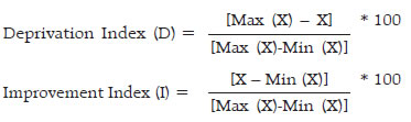 Rate Spread indicator obtained as the difference between the growth rate of GSDP and the average cost of borrowing. Average cost of borrowing of a particular year reflects the effective interest rate, i.e., the ratio of interest payments of the current year to the debt stock of the preceding year. IV.2 Methodology This study uses Relative Distance methodology for constructing the fiscal health index. The relative distance methodology involves comparing observations or variables in terms of their relative positions within a dataset rather than their absolute values. This approach helps in identifying patterns, similarities, and differences between data points. The distance between two data points can be measured through both parametric and non-parametric methods. While parametric methods make specific assumptions about the underlying distribution of the data, non-parametric methods make minimal assumptions about the same. Parametric methods are often computationally efficient and easy to interpret but may not perform well if the underlying assumptions are violated. Non-parametric methods are often used when the distribution is unknown or cannot be assumed to follow any specific form. Non-parametric methods are robust to the underlying distribution of the data but may be computationally challenging especially for large datasets. Thus, both parametric and non-parametric methods have their own advantages and disadvantages, and the choice between them often depends on the nature of the data and the specific problem at hand. This study uses relative distance with min-max (non-parametric) method of scaling or normalising data points for constructing the fiscal health index7. In the first step, the level of each of the indicators described above is normalised to an index value ranging from 0 to 100. This is similar to the methodology used to construct Physical Quality of Life Index (PQLI) (Morris, 1982) and Human Development Index (HDI) by the United Nations Development Programme (UNDP). This method can take both favourable and adverse parameters to construct an index. The index which is constructed for favourable indicators is called as the Improvement Index. The index which is formed by taking adverse parameters is called the Deprivation Index. The value of both the indices will lie between 0 and 100. Where, X refers to the actual value of the parameter for a given state. Max (X) and Min (X) are the maximum and minimum value of the parameter across the states in a specified period. The value of D and I will lie on a 0 to 100 scale where 0 depicts worst performance and 100 implies the best performance. In this study, for normalisation, the formula for deprivation index is applied on deficit indicators and debt burden indicators as they are negatively correlated to fiscal health of a state. On the other hand, the formula for improvement index is applied on revenue performance indicators, quality of expenditure indicators and debt sustainability indicators as they are positively correlated to fiscal performance. In the next step, the average of normalised indicators under each of the five different heads are computed to obtain five different matrices: Deficit Indicators Matrix, Revenue Performance Matrix, Quality of Expenditure Matrix, Debt Burden Matrix and the Debt Sustainability Matrix. The simple average of these five matrices yields the composite Fiscal Health Index (FHI) (Table 3). IV.3 Results The FHI reveals large variations in fiscal health of the Himalayan states/UTs (Table 4). In Period-1, Tripura, Meghalaya, Mizoram and Arunachal Pradesh emerged as the top four best performing Himalayan states. The FHI values of the Himalayan states/UTs ranged from 55 for Tripura to 40 for Jammu and Kashmir during this period. On the other hand, in Period-2, Mizoram, Assam and Tripura occupied the top three positions among the Himalayan states/UTs. Meghalaya, which was one of the top performing states in Period 1, slipped to 8th position in Period 2. The FHI values of most of the Himalayan states/UTs declined in period 2, indicating stress on their fiscal health (Chart 12). The decline is the sharpest in the case of Meghalaya (14 points), followed by Uttarakhand (12 points) and Tripura (7 points). The only exception is Assam which has witnessed an improvement in FHI value by 2 points. Interestingly, the FHI of other states also declined between Period 1 and Period 2, mainly on account of the impact of Covid 19 pandemic on the state finances in terms of lower tax revenue, higher expenses and the resulting rise in deficit indicators (Chart 12). The FHI values of the other states, however, remain above the Himalayan states/UTs. For most of the Himalayan states/UTs, there is a deterioration in the deficit indicator matrix in Period 2 (Appendix Table A); this could be attributed to the Covid 19 pandemic, which drove the consolidated GFD of Indian states to a peak of 4.1 per cent of GDP in 2020-21. The performance of the Himalayan states/UTs in terms of the Revenue Performance Matrix was comparatively better with six states improving their scores in Period 2 (Appendix Table B). Meghalaya had the best revenue performance in Period 2, followed by Uttarakhand and Mizoram. In terms of the Quality of Expenditure Matrix, five states showed an improvement in expenditure quality and six a deterioration in Period 2 (Appendix Table C). The Debt Burden Matrix of the Himalayan states/UTs shows a mixed picture with six of them recording a higher score in Period 2 compared to Period 1 (Appendix Table D). On the other hand, the Debt Sustainability Matrix of all the Himalayan states/UTs deteriorated in Period 2, with matrix value less than 30 for states like Uttarakhand, Jammu and Kashmir, Manipur and Sikkim (Appendix Table E). | Table 4: FHI values of Himalayan States/UTs | | Period 1 (2010-11 to 2014-15) | Period 2 (2015-16 to 2023-24) | | Rank | State/UT | Period 1 | Rank | State/UT | Period 2 | | 1 | Tripura | 55 | 1 |