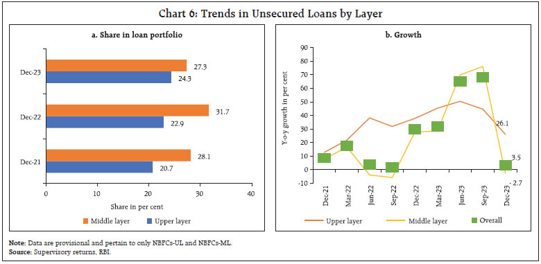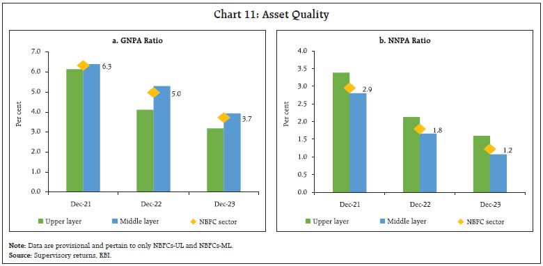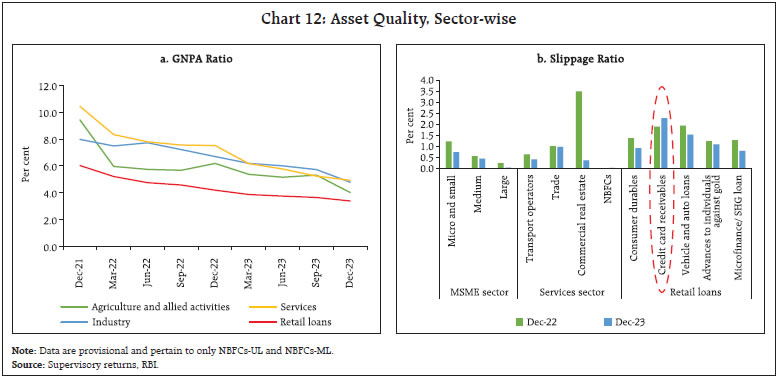 The asset quality of the sector has also improved. While the gross NPA (GNPA) ratio of upper layer NBFCs is lower than that of middle layer, the latter maintained adequate provisions to account for their riskier loan portfolio, thereby bringing their net NPA (NNPA) ratio below that of NBFCs-UL (Chart 11). The decline in the GNPA ratio has been seen across sectors, with retail loan segment having the lowest GNPA ratio despite high unsecured retail lending (Chart 12a). The slippage ratios7 in important categories of retail loans such as, inter alia, vehicle loans and gold loans, have been elevated vis-à-vis other sectors, although they have moderated at end-December 2023 except in credit card receivables segment (Chart 12b).
