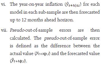 viii. The 12-month ahead root mean squared forecast error (RMSE) for the model i is estimated using the following formulae. A window size of 12 months has been used to calculate the RMSEs. These are estimated for each subsample. ix. The weights for the forecast combination are estimated as follows: where, N is the total number of models. x. These weights are used to calculate the weighted average of inflation forecasts from the individual models. xi. Furthermore, 216 different inflation point forecasts for each horizon are bifurcated in two groups – (a) above the weighted average forecast, (b) below the weighted average forecast. Then, the RMSE-weighted standard deviation is calculated for both groups (σ1 and σ2, where σ1 is the standard deviation of the forecasts above the weighted average forecast and σ2 is the standard deviation of the forecasts below the weighted average forecast). xii. Assuming a split-normal distribution asymmetric confidence intervals of desired significant levels can be calculated around each h-period ahead forecasts. xiii. Finally, the asymmetry of the forecast can be determined using the formulae: 3.3 Toolbox / Software The entire methodology described above has been programmed and a toolbox has been developed in MATLAB. 4. Empirical Findings 4.1 Estimated Inflation Forecast, Standard Deviation and Asymmetry: An Illustration The 12-month ahead performance-weighted inflation forecasts, standard deviation and asymmetry, which are estimated using the suit of models generated using the data till December 2023 is presented in Chart 1. The realised monthly inflation numbers for 2024 forecasted using the data till December 2023 fell well within the range of forecasts and was broadly aligned with performance-weighted forecasts. As expected, the standard deviations were higher for longer horizons. The asymmetricity was pointing towards an upward bias in the forecast. The comparison of the forecast accuracy of the performance-weighted forecasts vis-à-vis that of the individual models and the simple average forecasts for the entire sample period is carried out in the following sub-sections. 4.2 A Comparison of RMSEs: Individual Models Versus Performance-weighted: The average RMSE across the 12-month horizon of the performance-weighted forecasts for the headline and core inflation are found to be approximately 70 per cent lower than the benchmark random walk (RW) forecast. It is also found to be better than the forecasts generated by more than 75 per cent of models in all horizons. Certain models produce better forecasts in some horizons and for some windows. The best performers are not the same throughout all the horizons as well as for all the windows. However, a judicious combination of forecasts (like performance-weighting) helps to reduce biases arising out of such divergences (Charts 2 & 3). Unlike what witnessed for core inflation forecasts, the plateauing nature of the RMSEs for headline inflation forecasts as horizon increases may be due to the influence of the effect of the transitory shocks.