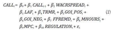 (ii) Spread of the Weighted Average Call Rate over Repo Rate: The call money market being the primary avenue for banks to transact in reserves and the policy repo rate being the midpoint of the LAF corridor, a rise in the spread of the WACR over the repo rate is usually associated with an increase in the overnight call volume as it indicates a heightened demand for reserves (Chart 7).  (iii) Transaction Volume in TREP and Market Repo Segments: The collateralised TREP and market repo segments provide avenue to banks as well as non-bank participants to lend and borrow for short term, largely overnight. Mutual funds (MFs) dominate the lending side of TREP, cornering more than 60 per cent of the share in terms of volume lent, while banks remain on the borrowing side. In market repo, which is subdivided into basket repo and special repo segments, PDs are the major borrowers with MFs and foreign banks being most active on the lending side. While the borrowing needs of PDs and banks are driven by their demand for reserves, the lending volume of MFs in the money market is largely an outcome of their investment mandate. Therefore, a heightened lending activity in the collateralised segment of the money market by MFs may, to an extent, lead to the fulfilment of demand of PDs and banks for short term liquidity, thereby leading to decline in Call volume. (iv) Government Flows: The RBI, being the banker to the Government of India (GoI) as well as to the state governments (except Sikkim), maintains their accounts into which taxes and other receipts flow and from which government expenditures and other payments are made. Transfers to and from the government accounts impact banking system liquidity. Large outflows to the government by way of tax collection or auction proceeds reduce banks’ reserve position, increasing Call market activity, while inflows to the banking system by way of government spending or bond maturities inject liquidity into the banking system, curtailing the need for banks and PDs to resort to Call market to seek reserves. In this study, we analyse the impact of large flows to and from the Government of India on a particular day on the Call volume. (v) Monetary Policy Announcement: Activity in the Call market is expected to spike on the days of the RBI’s monetary policy announcement as banks may choose to re-position their reserve balances ahead or post the Monetary Policy Committee (MPC) decision. (vi) USD/INR Forward Premia: The forward premium for a tenor for a currency pair should ideally reflect the interest rate differential between the currencies at that tenor. However, the forward premia may diverge from the interest rate differentials due to demand-supply dynamics or various market imperfections, creating arbitrage opportunities. When the short-term USD/INR forward premia are considerably wider than the difference between the short-term interest rates in India and the US, a bank may borrow in the Indian money market, receive the forward premia (i.e., do a buy-sell USD/INR swap) and lend in USD to earn a risk-free profit to the extent of the excess forward premia. On the other hand, if the short-term USD/INR forward premia are considerably narrower than the difference between the short-term interest rates in India and the US, a bank may borrow in USD, pay the forward premia (i.e., do a sell-buy USD/INR swap) and lend in the Indian money market to earn a risk-free profit to the extent of the deficit forward premia. While such transactions are subject to certain regulatory controls and other market frictions, they are expected to positively impact the volumes in the Call market. (vii) Market Hours: In the wake of the COVID-19 pandemic, trading hours for various markets regulated by the Reserve Bank, including the call money market, were truncated. The timings were subsequently normalized in a phased manner. Trading volume in Call market is expected to be lower during shorter market hours due to subdued overall market activity and vice versa. (viii) RBI Regulations: The Reserve Bank, vide its Master Direction8 dated April 1, 2021, instructed all eligible players in the call money market to acquire membership of NDS-CALL platform in due course of time. This is expected to have a negative bearing on Call volume as non-members of NDS-CALL were not able to participate in the market, at least temporarily till obtaining membership. V.2. Methodology and Empirical Results The descriptive statistics and the contemporaneous correlation matrix of the variables considered in the empirical analysis are given in Annex Tables A1 and A2. Augmented Dickey-Fuller (ADF) test was employed for checking stationarity (mean reverting property) of variables. The variables were found to be stationary at level (Annex Table A3). Prior to developing the model, the pairwise granger causality test was employed on the variables to understand the usefulness of the determinants considered for the analysis in predicting the future values of the response variable i.e., the volume of uncollateralised overnight segment of money market. The result of the test suggests that WACR spread over repo rate and net system liquidity have bidirectional relationship with Call market volume while the overnight collateralised segment of money market (TREP and market repo), government inflows and outflows, forward premia divergence, trading hours of call money market and the Reserve Bank’s regulation regarding the mandatory membership in NDS-CALL platform have one-sided granger causality on the overnight call money market segment. The MPC announcement do not granger cause the dependent variable (Table 2). OLS regression estimation often faces the challenge of dealing with autocorrelation in volatility or volatility clustering when using high frequency data (Annex Table A4). Hence, the GARCH (Generalised Autoregressive Conditional Heteroskedasticity) model is suitable as it takes into account the error variance, in which the