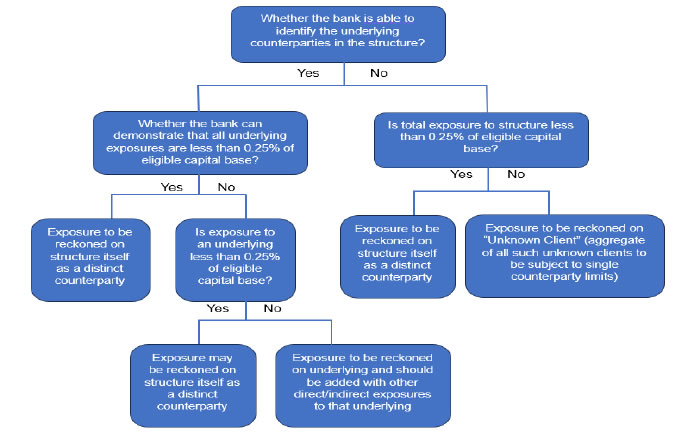 Had the bank been not able to identify underlying exposures, entire exposure to the structure (i.e. 100, which is greater than 0.25 percent of eligible capital base) would be exposure on ‘unknown client’. All such unknown clients would be treated as a single counterparty and single counterparty limit would apply on aggregate exposure to all such unknown clients. 84. The bank may assign the exposure amount to the structure itself, defined as a distinct counterparty, if it can demonstrate that the bank’s exposure amount to each underlying asset of the structure is smaller than 0.25 percent of its eligible capital base, considering only those exposure to underlying assets that result from the investment in the structure itself and using the exposure value calculated according to paragraphs 89 and 90. In this case, a bank may not look through the structure to identify the underlying assets. 85. The bank shall look through the structure to identify those underlying assets for which the underlying exposure value is equal to or above 0.25 percent of its eligible capital base. In this case, the counterparty corresponding to each of the underlying assets shall be identified so that these underlying exposures can be added to any other direct or indirect exposure to the same counterparty. The bank’s exposure amount to the underlying assets that are below 0.25 percent of the bank’s eligible capital base may be assigned to the structure itself (i.e. partial look-through is permitted). 86. If a bank is unable to identify the underlying assets of a structure: -