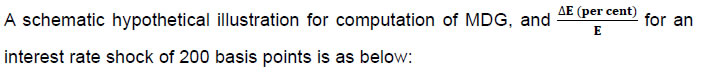 MDA and MDL are the weighted average of the Modified Duration (MD) of items of RSA and RSL respectively. 260. The MDG, reflecting the degree of duration mismatch in the RSA and RSL in a bank’s balance sheet, shall be calculated with the help of the following formula: A higher absolute value of the MDG shall indicate greater exposure of the bank to interest rate shocks. 261. The impact of changes in the interest rates on the MVE shall be evaluated by computing ΔE with the help of following formula: wherein: (1) Equity shall mean Net Worth as defined in Reserve Bank of India (Commercial Banks – Concentration Risk Management) Directions, 2025. (2) ‘ΔE’ stands for change in the value of equity. (3) ‘Δ i’ stands for change in interest rates in percentage points (1 per cent change to be written as 0.01).