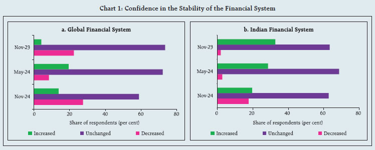 One fifth respondents showed higher level of confidence and three fifths showed similar level of confidence in the financial stability. Notably, a higher number of respondents have expressed decreased level of confidence in the stability of the global and domestic financial system from the previous survey rounds (Chart 1 a and b). -