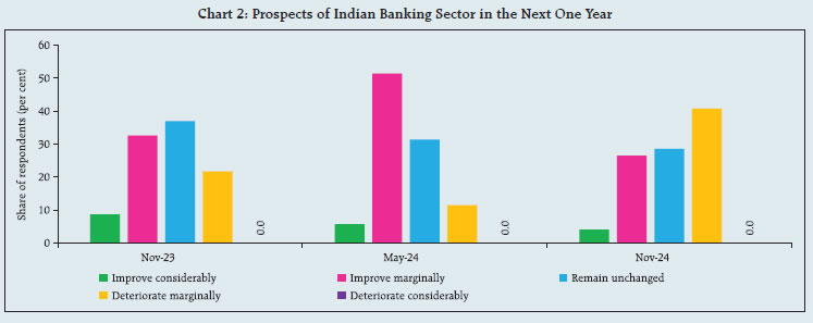 60 per cent of the respondents assessed better or similar prospects for the Indian banking sector over one year horizon, as compared to 88 per cent respondents in the previous survey round (Chart 2). -