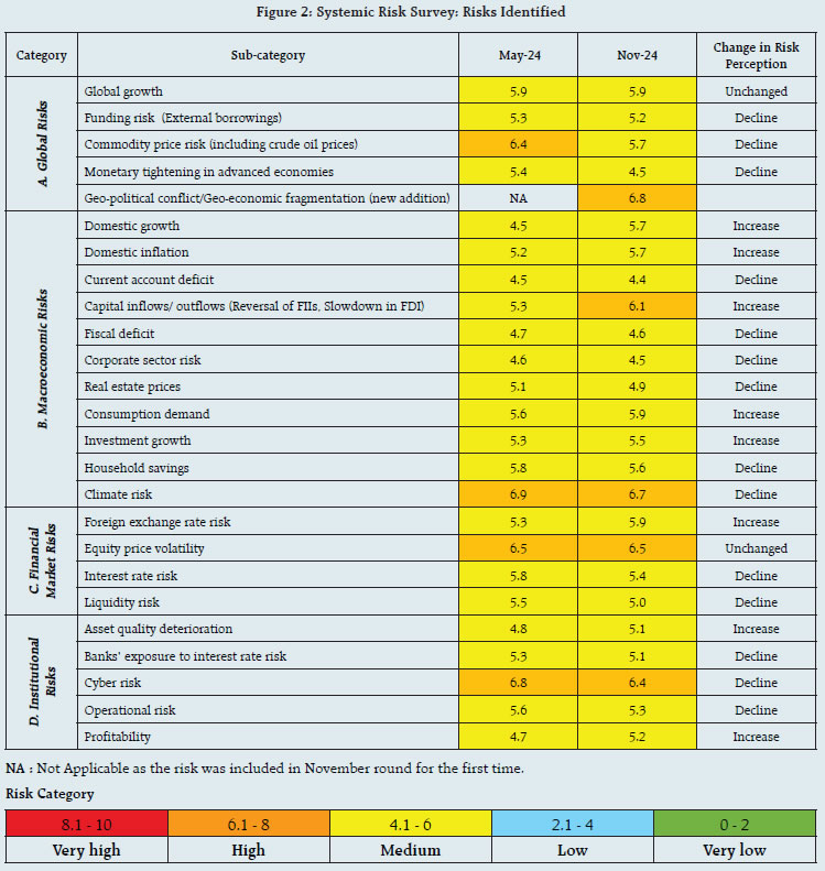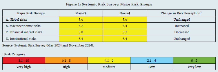 In the latest round of the Systemic Risk Survey, all major groups continued to remain in the medium risk category. Global and institutional risks remained unchanged while financial market risks eased marginally. Domestic macroeconomic risks increased on concerns related to domestic growth, inflation and capital flows. Going forward, respondents’ perceptions of key risks to financial stability included: geopolitical risks; concerns over domestic growth; cyber security; and climate risk. | The 27th round of the Reserve Bank’s Systemic Risk Survey (SRS) was conducted in November 2024 to solicit perceptions of experts, including economists and market participants, on major risks faced by the Indian financial system. In addition to key global and macroeconomic factors, the current round of the survey also gauged sentiments on (i) impact of rising global economic uncertainty on India’s macro-financial stability and (ii) revival of private capex cycle. A summary of feedback received from 51 respondents is presented below. -
