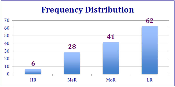High Risk (HR) banks - banks with total RPs below 50; Benchmarks proposed above are in tune with the ones used internationally. (Recommendation 27) Simulation 4.21 One of the terms of reference for the Committee was to recommend a matrix of premium rates corresponding to risk-ratings in a manner that there was least disturbance to the levels of existing premium inflows. For this exercise, the Committee recognised that it should categorise the banks into different risk groups based on the proposed rating model and discover the appropriate premium rates to achieve the objectives of this term of reference. 4.22 The Committee also took cognisance of the fact that DICGC’s membership was large in number and varied in characteristics. The Committee therefore adopted a sample based approach for simulation exercise. The Committee felt the need to capture 90% or above of the assessable deposits through the sample. It found that the kind of data required for the model was more readily available in respect of all scheduled commercial banks and scheduled urban cooperative banks with the respective supervisors. The Committee therefore decided to restrict the simulation exercise to these banks. The Committee selected a sample of 87 commercial banks and 50 scheduled UCBs. These banks together, captured 92% of total assessable deposits as on March 31, 2014. The banks in sample were subjected to evaluation under the rating model proposed and the model generated a frequency distribution of banks under broad categories as per Table 6 (Chart 5) below. | Table 6: Frequency Distribution of Bank Groups as per RPs | | (Scenario 1) | | RP Range | Zone | Frequency Distribution | | <50 | HR | 6 | | 50 - 65 | MeR | 28 | | 65-80 | MoR | 41 | | =>80 | LR | 62 | | Total | | 137 | Chart 5: Frequency Distribution of Bank Groups as per RPs (Scenario 1) The distribution reveals a mixed pattern among the various banking groups with foreign banks faring among the best. Premium Rates and Spreads 4.23 The Committee argued that premium should progress along the rating scale in a curvilinear manner so as to build up an incentive in the form of material gain through premium saving if a bank improved to better risk category. Committee accordingly recommends the following premium rate structure (Table 7, Chart 6) with a rising step up as the rating deteriorates. | Table 7: Premium Rates and Spreads | | Rating | Base Premium Rate* (paise % pa) | Multiplicative Factor* | Effective PremiumRate | Step Up | | (1) | (2) | (3) | (4)=(2)*(3) | | | LR | 10.00 | 0.95 | 9.5 | - | | MoR | 10.00 | 1.00 | 10.0 | 0.5 | | MeR | 10.00 | 1.10 | 11.0 | 1.0 | | HR | 10.00 | 1.25 | 12.5 | 1.5 | | * For discussion on Base Premium Rate and Multiplicative Factor, please refer to paragraph 3.17 |
