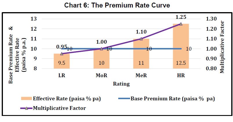 High Risk (HR) banks - banks with total RPs below 50; (Paragraph 4.20) Recommendation 28 5.29 Based on the results of a simulation conducted across 87 commercial banks and 50 scheduled urban cooperative banks, together capturing 92% of assessable deposits and ensuring that the premium collection is not adversely affected, the Committee recommends following premium rate structure: | Rating | Base Premium Rate (paise % pa) | Multiplicative Factor | Effective Premium Rate | Step Up | | (1) | (2) | (3) | (4)=(2)*(3) | | | LR | 10 | 0.95 | 9.5 | - | | MoR | 10 | 1 | 10 | 0.5 | | MeR | 10 | 1.1 | 11 | 1 | | HR | 10 | 1.25 | 12.5 | 1.5 | (Paragraph 4.23) Recommendation 29 5.30 For placing the banks on a transition path and enabling them an opportunity to improve their financials before the proposed classification rules set in, the Committee recommends application of relaxed classification rules for first year, as under: -