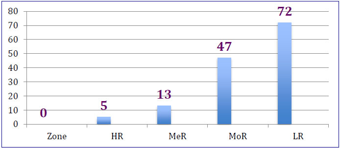 High Risk (HR) banks - banks with total RPs below 45; (Recommendation 29) Transition would help banks to take note of the disadvantages of being high in the risk category and therefore provide one year to improve their financials. 4.26 The application of relaxed standards results in the following classification of the banks in the sample (Table 9, Chart 7). Table 9: Frequency Distribution of Bank Groups as per RPs (Scenario 2) | | RP | Zone | Frequency Distribution | | <45 | HR | 5 | | 45 - 60 | MeR | 13 | | 60-75 | MoR | 47 | | =>75 | LR | 72 | | Total | | 137 | Chart 7: Frequency Distribution of Bank Groups as per RPs The changes in the premium accruing to the DICGC are as under: | Table 10: Scenario 2 (Benchmark relaxed for Year 1) | | Risk Category | LR | MoR | MeR | HR | Total | | Premium at Existing Rates | 13,230 | 22,892 | 2,794 | 17 | 38,933 | | Premium at Revised Rates | 12,568 | 22,892 | 3,074 | 21 | 38,557 | | Excess (+)/Short (-) Collection % | -5.00 | 0.00 | 10.00 | +25.00 | -0.97% | It is observed that there would be a small under collection of premium by 0.97% from banks in the sample. Reserve Ratio Target and Premium Rates 4.27 As stated in Chapter 3, the Corporation is striving to reach an informal target Reserve Ratio of 2.5, which as on 31 March 2015 stood at 1.93. There is a need to adopt a Target Reserve Ratio on a more scientific basis. The target for Reserve Ratio in general should, at minimum, cover the potential losses, as deposit insurance agency may suffer under normal circumstances. Internationally, the DIAs that have set up the Reserve Ratio targets have largely adopted two approaches while doing so – (1) Historical Loss Method and (2) Credit Portfolio Approach. The Target Reserve Ratio should also be dynamic so as to be responsive to evolving banking conditions, be these be bank specific or general. It may therefore be re-assessed periodically that it reflects the contemporary insurance risk of the Corporation. The Committee therefore recommends the Corporation too should work towards setting up Target Reserve ratio after a due process and it is subjected to periodic review so that it remains current and is reflective of Corporation’s ongoing insurance risk. (Recommendation 30) 4.28 Once the Target Reserve ratio is achieved, there would be case for having a relook at the premium rates. the Corporation may revisit the premium rates and if the need be, moderate them to appropriate levels while ensuring that the Target remains achieved on a continuous basis. Similarly, in case the Reserve ratio falls below the Target, the premium rates may be revised upward to restore the Reserve Level to the Target. (Recommendation 31)