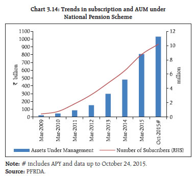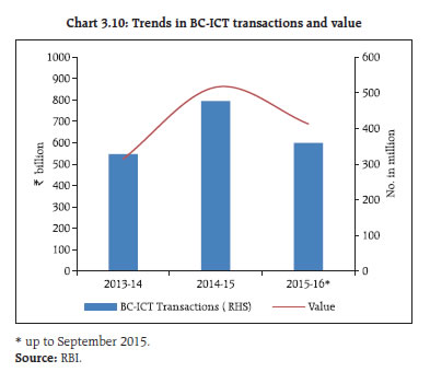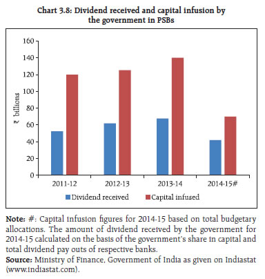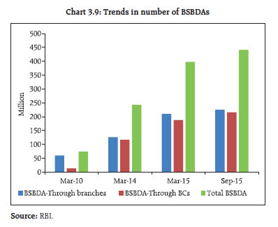 3.22 While loans for projects under implementation whose asset quality is linked to their attainment of date of commencement of commercial operation (DCCO) have been a major area of concern, the Reserve Bank has allowed certain concessions regarding attaining DCCO for project loans, in view of complexities in project implementation as also numerous exogenous factors affecting the DCCO of a project. Under the structured financing of project loans, banks are allowed to extend structured long-term project loans with the amortisation schedule linked to their economic life, and to provide periodic refinancing option to projects in the infrastructure and core industries sector. Banks are also allowed to refinance their existing infrastructure and other project loans by way of take-out financing even without a pre-determined agreement with other banks / financial institutions. 3.23 While such regulatory steps along with those related to ‘take-out financing’, and enabling regulations for raising long-term bonds by banks for financing their project loans seek to address some of the concerns, in view of the riskiness on account of the tenor of the loan, the banks’ processes and business models may not yet be adequately prepared to make, monitor and manage long-term project loans. Therefore, entities with long term investible resources such as pension funds and insurance companies need to be encouraged in this space (refer to para 3.45).12 Addressing the challenges being faced by PSBs 3.24 As discussed in previous FSRs, while the PSBs continue to play a vital role in Indian economy and financial system, they have been lagging their private sector counterparts on performance and efficiency indicators. Presently the PSBs with a predominantly high share in infrastructure financing are observed to be facing the highest amount of stress in their asset quality and profitability. Despite their developmental objectives, PSBs as financial intermediaries, need to operate on commercial considerations, to remain viable. Reforms under ‘Indradhanush’ initiative of government 3.25 In August 2015, government rolled out a seven pronged plan (named ‘Indradhanush’13) aimed at improving the performance of PSBs. The initiatives under this revamp plan cover aspects such as (i) appointments with separation of the post of managing director and non-executive chairman in some large PSBs, (ii) proposal for a ‘bank board bureau’ (BBB), (iii) plan for capitalisation (₹700 billion from budgetary allocations for four years up to financial year 2018- 1914), (iv) plan for de-stressing banks’ books, (v) empowerment of PSBs by encouraging them to take the business decision independently – without interference from government, (vi) a new framework for accountability based on ‘key performance indicators’ (KPI) and (vii) better governance through continuous engagement with banks. As envisaged under these reforms, they are expected to work as ‘private’ entities in terms of their business strategies, operations, controls and financial targets. Therefore, the business models of PSBs, their capital structures and dividend policies need a review. Directed lending and financial inclusion effort 3.26 Directed lending involves implicit and explicit subsidies and such costs should ideally be borne by the state so as not to compromise with the best banking practices and loan discipline. Loans to public utilities (for instance ‘discoms’) ultimately turn out to have quasi fiscal implications and it is important to inculcate the habit of paying user charges while dealing with subsidies separately without any impact on established lending norms. On the other hand, while there is a need to promote financial inclusion, it needs to be executed in a manner that is not detrimental to established commercial banking practices. If the implementation of financial inclusion is pushed beyond a point, it may have negative costs to the system. As progress on the governance and operational reforms takes hold, the gap between the culture and performance of PSBs vis-à-vis the performance of private sector banks is expected to narrow down. If the inherent strengths of PSBs, in terms of their reach and experience in delivering banking services to a larger geographical and demographical domain are to be used, their efforts should be suitably compensated on commercial considerations. Capital infusion and dividend decision at PSBs 3.27 It is observed that PSBs pay out significant amounts as dividend to the government (Chart 3.8) and other shareholders which have no relevance to their balance sheet strengths and capital planning. This also reveals a cross-subsidisation by better banks (given their relatively higher pay outs but a disproportionately higher capital infusion into weaker banks by the government). This pattern of dividend pay outs is not consistent with the dividend irrelevance theory.15 Thus, it is imperative that PSBs approach their dividend decisions as strategic business decisions which are in keeping with their objective of shareholder wealth maximisation.  Financial inclusion Financial inclusion plans: Progress made during April - September 2015 3.28 Financial inclusion plans (FIPs) submitted by banks which are duly approved by their boards form a part of the business strategies of the banks. The comprehensive FIPs capture data relating to progress based on various parameters including basic savings bank deposit accounts (BSBDAs), small credits and business correspondent-information and communication technology (BC-ICT) transactions. There was a considerable increase in the opening of BSBDAs during the year because of the government’s initiative under the Pradhan Mantri Jan Dhan Yojana (PMJDY). BSBDAs reached 441 million as at end September 2015 as against 398 million as at end March 2015 (Chart 3.9). 3.29 The total number of banking outlets went up from 553,713 as at end March 2015 to 567,530 as at end September 2