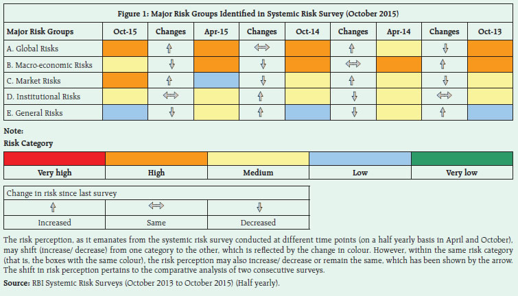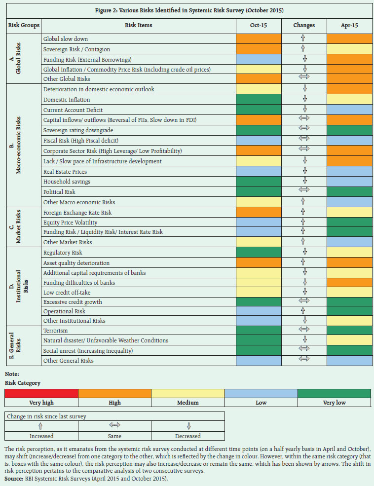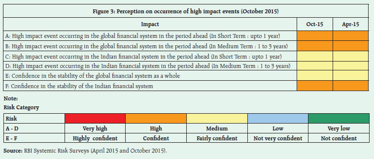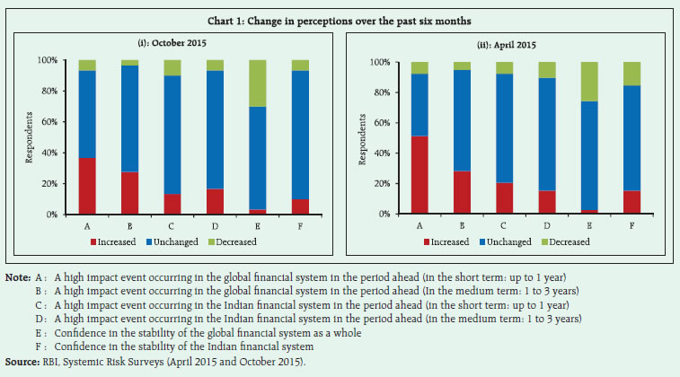 The Systemic Risk Survey (SRS), the ninth in the series, was conducted in October 20151 to capture the perceptions of experts, including market participants, on the major risks the financial system is facing presently. The results indicate that global risks continued to be perceived as major risks affecting the financial system in a high risk category. The macroeconomic risks moved to the medium risk category. Market risks have been perceived to be elevated to high risk category from the low risk category, showing a cyclical nature with rise & fall observed in alternative rounds of survey. On the other hand, the Institutional risks remained in the medium risk category. General risks have decreased in this survey (Figure 1). Within global risks, the risk of a global slowdown and sovereign risks increased in the current survey, whereas the global funding and global inflation risks indicated a downward shift. Within the macroeconomic risk category, risks from deterioration in the domestic economic outlook declined to the medium risk category in the current survey, while the risks on account of domestic inflation and current account deficit have declined considerably. The capital flows and corporate sector risks remained elevated in the high risk category. The respondents have rated the foreign exchange risk, equity price volatility and funding risk as having increased in the current survey. Among the institutional risks, while the asset quality of banks was still perceived as a high risk factor, the risk on account of low credit off-take has marginally receded (Figure 2).   Participants in the current round of survey felt that there is an increased possibility of a high impact event occurring in the global financial system in the period ahead (short to medium term). Their confidence in the global financial system was moderate, and a greater number participants indicated that their confidence has marginally reduced during the past six months. However, according to participants, there is ‘medium’ possibility of an occurrence of a high impact event in the Indian financial system in the period ahead (short to medium term) even though the respondents continued to show their confidence in the Indian financial system (Figure 3 and Chart 1).