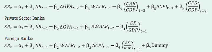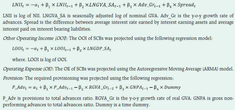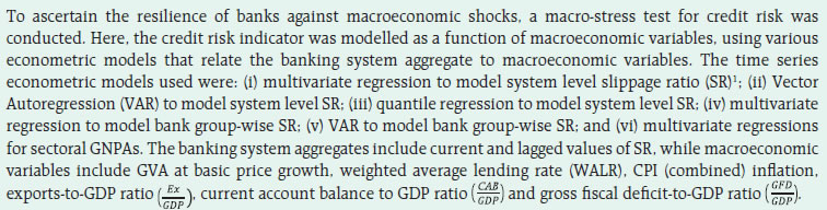 Corporate sector Assessment of impact of weakness in debt servicing capacity of NGNF companies on bank credit 1. The Basic Statistical Returns (BSR) give the data on total bank credit of scheduled commercial banks (SCBs) and also the bank credit to private non-financial corporations [i.e. non-government non-financial (NGNF) public and private limited companies]. From this, the share of bank credit to NGNF companies out of total bank credit was calculated. 2. Using a sample of Ministry of Corporate Affairs (MCA) database, the ratio of bank borrowing of “weak” NGNF companies to total bank borrowings of all NGNF companies in the sample was worked out. Similarly the ratio of bank borrowings of “leveraged weak” NGNF companies to total bank borrowings of the sample was also worked out. 3. In order to assess the vulnerability of bank credit due to “weak” and “leveraged weak” companies, the ratios arrived at in para 2 (above) was applied on the BSR credit data (para 1 above).Thus the share of bank credit to “weak” companies as a percentage of total bank credit and share of bank credit to “leveraged weak” companies as a percentage of total bank credit were arrived at. Scheduled commercial banks Banking stability map and indicator The banking stability map and indicator present an overall assessment of changes in underlying conditions and risk factors that have a bearing on the stability of the banking sector during a period. The five composite indices used in the banking stability map and indicator represent the five dimensions of soundness, asset-quality, profitability, liquidity and efficiency. The ratios used for constructing each composite index are given in Table 1. | Table 1: Ratios used for constructing the banking stability map and the banking stability indicator | | Dimension | Ratios | | Soundness | CRAR # | Tier-I Capital to Tier-II Capital # | Leverage Ratio as Total-Assets to Capital and Reserves | | Asset- Quality | Net NPAs to Total- Advances | Gross NPAs to Total- Advances | Sub-Standard-Advances to Gross NPAs # | Restructured-Standard- Advances to Standard- Advances | | Profitability | Return on Assets # | Net Interest Margin # | Growth in Profit # | | Liquidity | Liquid-Assets to Total-Assets # | Customer-Deposits to Total-Assets # | Non-Bank-Advances to Customer-Deposits | Deposits maturing within-1-year to Total Deposits | | Efficiency | Cost to Income | Business (Credit + Deposits) to Staff Expenses # | Staff Expenses to Total Expenses | | Note: # Negatively related to risk. | Each composite index, representing a dimension of bank functioning, takes values between zero and 1. Each index is a relative measure during the sample period used for its construction, where a higher value means the risk in that dimension is more. Therefore, an increase in the value of the index in any particular dimension indicates an increase in risk in that dimension for that period as compared to other periods. For each ratio used for a dimension, a weighted average for the banking sector is derived, where the weights are the ratio of individual bank assets to total banking system assets. Each index is normalised for the sample period using the following formula:  Where, Xt is the value of the ratio at time t. A composite index of each dimension is calculated as a weighted average of normalised ratios used for that dimension where the weights are based on the marks assigned for assessment for the CAMELS rating. The banking stability indicator is constructed as a simple average of these five composite indices. Estimation of losses: Expected losses, unexpected losses and expected shortfalls of SCBs The following standard definitions were used for estimating these losses: Expected Loss (EL) | : EL is the average credit loss that the banking system expects from its credit exposure. | Unexpected Loss (UL) | : UL at 100(1-α) per cent level of significance is the loss that may occur at the α -quantile of the loss distribution minus expected loss. | Expected Shortfall (ES) | : When the distributions of loss (Z) are continuous, expected shortfall at the 100(1- α) per cent confidence level (ESα (Z)) is defined as, ESα (Z) = E[Z | Z ≥VaRα (Z)] minus expected loss. Hence, Expected Shortfall is the conditional expectation of loss given that the loss is beyond the VaR level minus expected loss. | These losses were estimated as: Loss = PD X LGD X EAD | where, EAD = | Exposure at Default, is the total advances of the banking system. EAD includes only on-balance sheet items as probability of default (PD) was derived only for on-balance sheet exposures. | | LGD = | Loss Given Default. Under the baseline scenario, the average LGD was taken as 60 per cent as per the RBI guidelines on ‘Capital Adequacy — The IRB Approach to Calculate Capital Requirement for Credit Risk’. LGD was taken at 65 per cent and 70 per cent under medium and severe macroeconomic scenarios respectively. | | PD = | PD was defined as gross non-performing advances to total advances ratio. Due to non-availability of data on the number of default accounts, the size of default accounts (that is, the GNPA amount) was used for derivation of PDs. | The losses- EL, UL and ES, were estimated by using a simulated PD distribution. As a first step an empirical distribution of PD was estimated using the Kernel Density Estimate. Then using the empirically estimated probability density function, 20,000 random numbers were drawn based on the Monte Carlo simulation. Finally, EL, UL and ES were calculated by taking PDs as average PD, 99.9 per cent VaR of PD and average PD beyond 99.9 per cent loss region respectively. Macro-stress testing  While multivariate regression allows evaluating the impact of select macroeconomic variables on the banking system’s GNPA and capital, the VAR model reflects the impact of the overall economic stress situation on the banks’ capital and GNPA ratios, and also takes into account the feedback 