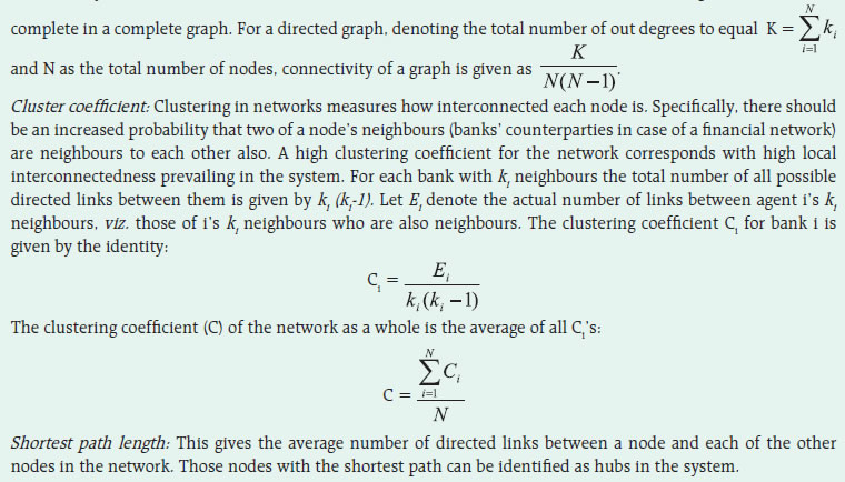 Scenario III: GNPA increased by 3 SD from the current level. The assumed increase in GNPAs was distributed across sub-standard, doubtful and loss categories in the same proportion as prevailing in the existing stock of GNPAs. The additional provisioning requirement was adjusted from the current capital position. The stress test was conducted at individual NBFC level as well as at the aggregate level. Interconnectedness — Network analysis Matrix algebra is at the core of the network analysis, which uses the bilateral exposures between entities in the financial sector. Each institution’s lendings to and borrowings from all other institutions in the system are plotted in a square matrix and are then mapped in a network graph. The network model uses various statistical measures to gauge the level of interconnectedness in the system. Some of the important measures are given below: Connectivity: This statistic measures the extent of links between the nodes relative to all possible links in a  In-betweeness centrality: This statistic reports how the shortest path lengths pass through a particular node. Eigenvector measure of centrality: Eigenvector centrality is a measure of the importance of a node (bank) in a network. It describes how connected a node’s neighbours are and attempts to capture more than just the number of out degrees or direct ‘neighbours’ that a node has. The algorithm assigns relative centrality scores to all nodes in the network and a nodes centrality score is proportional to the sum of the centrality scores of all nodes to which it is connected. For a NxN matrix there will be N different eigen values, for which an eigenvector solution exists. Each bank has a unique eigen value, which indicates its importance in the system. This measure is used in the network analysis to establish the systemic importance of a bank and by far it is the most crucial indicator. Tiered network structures: Typically, financial networks tend to exhibit a tiered structure. A tiered structure is one where different institutions have different degrees or levels of connectivity with others in the network. In the present analysis, the most connected banks (based on their eigenvector measure of centrality) are in the innermost core. Banks are then placed in the mid-core, outer core and the periphery (the respective concentric circles around the centre in the diagrams), based on their level of relative connectivity. The range of connectivity of the banks is defined as a ratio of each bank’s in degree and out degree divided by that of the most connected bank. Banks that are ranked in the top 10 percentile of this ratio constitute the inner core. This is followed by a mid-core of banks ranked between 90 and 70 percentile and a 3rd tier of banks ranked between the 40 and 70 percentile. Banks with a connectivity ratio of less than 40 per cent are categorised as the periphery. Solvency contagion analysis The contagion analysis is in nature of stress test where the gross loss to the banking system owing to a domino effect of one or more banks failing is ascertained. We follow the round by round or sequential algorithm for simulating contagion that is now well known from Furfine (2003). Starting with a trigger bank i that fails at time 0, we denote the set of banks that go into distress at each round or iteration by Dq, q= 1,2, …For this analysis, a bank is considered to be in distress when its core CRAR goes below 6 per cent. The net receivables have been considered as loss for the receiving bank. Liquidity contagion analysis While the solvency contagion analysis assesses potential loss to the system owing to failure of a net borrower, liquidity contagion estimates potential loss to the system due to the failure of a net lender. The analysis is conducted on gross exposures between banks. The exposures include fund based and derivatives ones. The basic assumption for the analysis is that a bank will initially dip into its liquidity reserves or buffers to tide over a liquidity stress caused by the failure of a large net lender. The items considered under liquidity reserves are: (a) excess CRR balance; (b) excess SLR balance; (c) available marginal standing facility; and (d) available export credit refinance. If a bank is able to meet the stress with liquidity buffers alone, then there is no further contagion. However, if the liquidity buffers alone are not sufficient, then a bank will call in all loans that are ‘callable’, resulting in a contagion. For the analysis only short-term assets like money lent in the call market and other very short-term loans are taken as callable. Following this, a bank may survive or may be liquidated. In this case there might be instances where a bank may survive by calling in loans, but in turn might propagate a further contagion causing other banks to come under duress. The second assumption used is that when a bank is liquidated, the funds lent by the bank are called in on a gross basis, whereas when a bank calls in a short-term loan without being liquidated, the loan is called in on a net basis (on the assumption that the counterparty is likely to first reduce its short-term lending against the same counterparty). Joint solvency-liquidity contagion analysis A bank typically has both positive net lending positions against some banks while against some other banks it might have a negative net lending position. In the event of failure of such a bank, both solvency and liquidity contagion will happen concurrently. This mechanism is explained by the following flowchart: The trigger bank is assumed to have failed for some endogenous reason, i.e., it becomes insolvent and thus impacts all its creditor banks. At the same time it starts to liquidate its assets to meet as much of its obligations as possible. This process of liquidation generates a liquidity contagion as the trigger bank starts to call back its loans. The lender/creditor banks that are well capitalised w