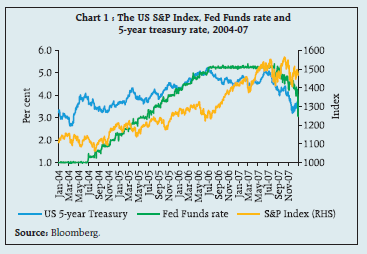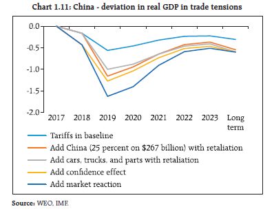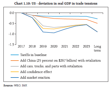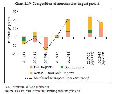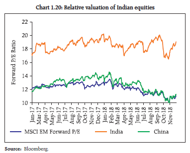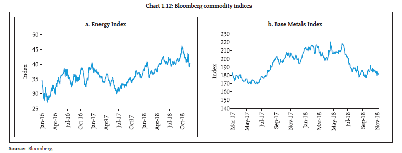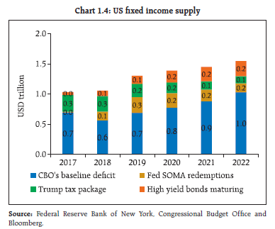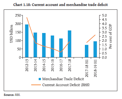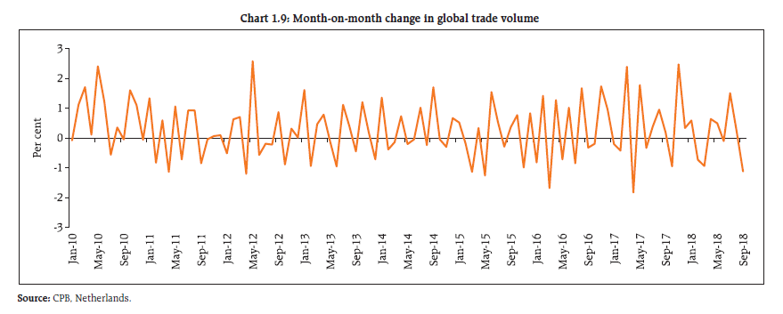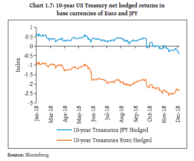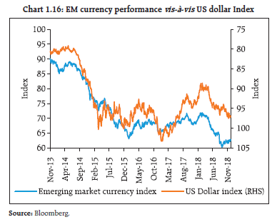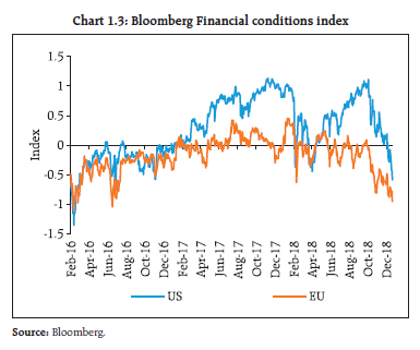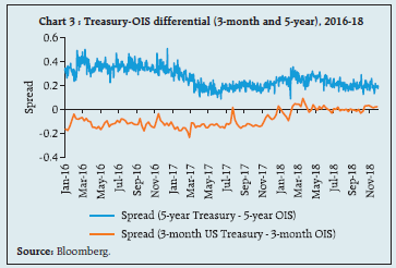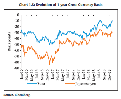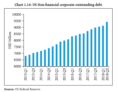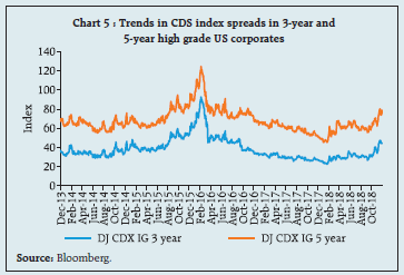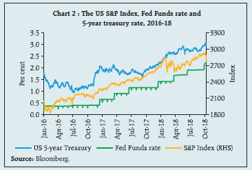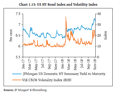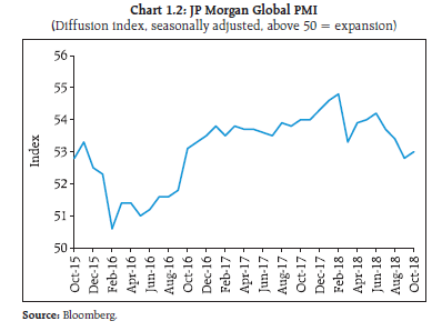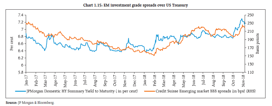 The global growth outlook for 2018 and 2019 remains steady although the underlying downside risks have risen. The upward trend in policy rates in the US along with greater supply of US treasuries will adversely affect capital flows to emerging markets (EMs) and exert upward pressure on interest rates and corporate spreads. In the meanwhile, commodity prices, particularly oil, have softened, mostly driven by excess supply of US shale oil, uncertainty about Chinese demand and on supply concerns from Iran turning out softer than anticipated. In the domestic financial markets, structural shifts in credit intermediation and the evolving interconnectivity between banks and the non-banks calls for greater vigilance. Global economy 1.1 Global growth for 2018 and 2019 is projected1 to remain at the 2017 level of 3.7 per cent (Chart 1.1), though the expansion has become less balanced and the downside risks to global growth have risen since the publication of the previous Financial Stability Report (FSR). The global PMI2 (Chart 1.2), while still expansionary, also points to ebbing of activities. The key drivers of risk are trade conflict, inflation risk in Advanced Economies (AEs) and normalisation of their monetary policies and central banks’ balance sheets. Nevertheless, AEs are expected to grow at 2.4 per cent in 2018 (a marginally faster pace than in 2017) and 2.1 per cent in 2019 while growth in Emerging Markets and Developing Economies (EMDEs) is expected to be steady at 4.7 per cent in both 2018 and 20193, though the latter will be susceptible to a stronger dollar, emerging dynamics on the global trade front, and geopolitical risks. 1.2 In the meanwhile, financial conditions in AEs have tightened as their monetary policy regimes shift towards normalcy. The recent tightening in financial conditions (Chart 1.3) in the US is largely driven by volatility swings in equity markets and the marginal widening of investment grade credit spreads. After the latest Fed rate hike in December 2018, the aggregate policy regime in US appears to have significantly tightened as per the latest financial conditions index (FCI), leading to median rate hike forecast for 2019 being trimmed from three to two. Financial conditions in Europe remain constricted by the developments in Britain and Italy. Indications from Bank of Japan (BoJ) point towards a rethink in its Quantitative Easing (QE) program although the reaction of currency markets is muted, so far.   1.3 Hence, the underlying global macro-financial conditions coupled with geopolitical uncertainty have potentially increased spillover risk to EMDEs. The spillover risks are tracked in four dimensions: i. Supply of safe assets; ii. Protectionist trade policies; iii. Commodity market behaviour; and iv. Direction of capital flows. (i) Supply of safe assets 1.4 Tax cuts in the US are expected to add US dollar (USD) 1.5 trillion to the US budget deficit over 10 years (Chart 1.4). The enhanced borrowing requirement, coupled with a shrinking balance sheet of the US Federal Reserve (FED) could be a significant near-term risk to the market. With a gradual normalisation of the global monetary policy, the possibility of a substantial increase in the supply of USD denominated safe assets concurrent with a robust US fixed income issuance across high yield and investment grades poses risks of pushing treasury rates higher and corporate spreads wider while impacting the US dollar. Some of the issues relating to asset pricing implications of rising US Federal Funds rate is explored in Box 1.1.   Box 1.1 : Is this time different? Risk-free curve and movement in corporate spreads in US rate increase cycle The movement in US Federal Funds rate and its consequent impact on the US treasury term-structure has implications for global interest rates. This discussion contrasts the impact of US Federal Funds rate rises during 2004-07 and the ongoing one, specifically with regard to the impact on US Treasury term-structure and corporate spreads. Charts 1 & 2 plot the evolution of US Federal Funds (fed funds) rate, S&P Index and 5-year treasury yield for 2004-07 and 2016-18. As can be seen, 5-year US Treasury yield differential with the fed funds rate during 2004-07 was narrower with the former occasionally lower than the overnight fed funds rate in sharp contrast to 2016-18 wherein the 5-year US Treasury yield has been consistently and at times significantly higher. Chart 3 gives the yield differential between 5-year and 3-month treasury and OIS yields. Both are risk-free, OIS by construction (through centralised clearing and day end collateral transfer) and US Treasury (UST) by definition. As the trend in Chart 3 shows, the spread with respect to 3-month has nudged higher since September 2017 towards zero, while the 5-year spread has been consistently positive. A contrast with 2004-07 (Chart 4) clearly shows that the UST-OIS differential currently is possibly pointing at the future supply of USTs induced by the US structural budget deficit although the puzzle with regard to sustenance of such positive spreads is that such spreads are arbitrageable and such arbitrages carry little risk, if taken to maturity. The positive differential in spreads in the longer tenor predates the recent tax reforms. Such widening of spreads of long tenor US treasuries has an impact on corporate funding rates as most of the recent corporate issuances are being benchmarked to the US treasury curve and not the risk-free swap curve.     Chart 5 plots the evolution of 3-year and 5-year US CDS spreads implied by the respective indices. As can be seen in the chart, the declining trend in spreads in both the indices which was almost coterminous with the increase in Fed interest rate (December 2015) have reversed since December 2017, again almost coterminous with the passage of American tax reform. While no clear trend in respect of movement in corporate spreads can be seen in 2018, there has been significant vol
