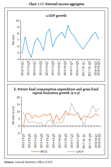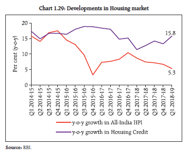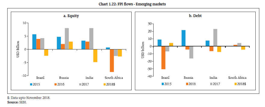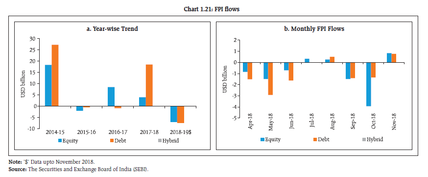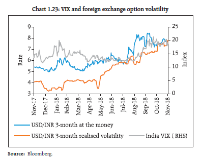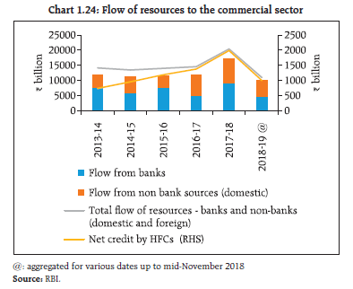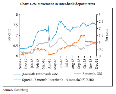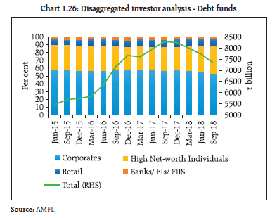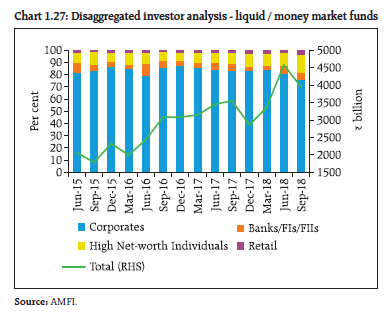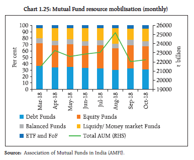 D. Financial markets 1.17 The recent volatility in India VIX was mirrored in foreign exchange (Fx) implied volatility as also in Fx realised volatility. While there is no specific lead and lag relationship between Fx implied volatility and India VIX, all the three market parameters are significantly off their lows in the current financial year8 (Chart 1.23). Credit intermediation by mutual funds and certain emerging issues 1.18 Chart 1.24 plots the flow of resources to the commercial sector over the last 5 years. After declining in 2016-17, the banks’ share in reported flow of credit, increased sharply in 2017-18 possibly owing to the large recapitalisation of public sector banks (PSBs) undertaken during the financial year. A significant part of the increase in non-bank sources of reported credit (domestic) witnessed during 2017-18 was because of the increased data coverage of government non-banking financial intermediaries. During 2018-19 (till mid-November), the relative proportion of domestic bank and non-bank resources was almost evenly matched. With regard to the flow of resources from domestic non-bank sources, the share of net credit by housing finance companies (HFCs) in the total flow of credit (from domestic sources) nearly doubled from 6.2 per cent in 2013-14 to 11.7 per cent in 2017-18. The share of foreign resources in the total flow of credit to the commercial sector was largely range-bound between 16-19 per cent during the period under observation, with foreign direct investment (FDI) being the dominant contributor. 1.19 Mutual funds (MF) have played a catalytic role in the reshaping of the non-bank financial intermediation outlined earlier. The recent episode in the wake of IL&FS default however underlined certain issues in this market intermediated credit provisioning structure, the narrative on which can be broadly divided into: a) Nature of credit intermediation of MFs and the IL&FS incident induced dislocation; b) Price impact of MF dislocation with specific focus on money market rates; c) Fair value of corporate issuances in banks and MFs; and d) Credit concentration in MF portfolios and possible behavioural implications. a) Nature of credit intermediation of MFs and IL&FS incident induced dislocation 1.20 Mutual Funds have about ₹ 65 billion of IL&FS group exposure out of a total debt of around ₹ 900 billion. Mutual Funds have passed the default risk to investors as a pass-through vehicle. Chart 1.25 traces the growth and the relative size of funds based on the nature of assets. As is evident in the chart, debt and liquid/money market funds have a dominant share which has remained mostly stable and as on September 2018 constituted 51 per cent of the AUM. A disaggregated investor analysis of debt and liquid/money market funds shown in Charts 1.26 and 1.27 reveals that high net-worth individuals/corporates/banks and financial institutions constituted around 90 per cent of the total corpus for debt funds (as on September 2018) whereas for liquid/money market funds the proportion of the same cohort was greater than 95 per cent. In sharp contrast to the investor profile in debt and liquid/money market funds, close to 50 per cent of the investors in equity funds comprise retail investors.  b) Price impact of credit dislocation with specific focus on money market rates 1.21 The spread between 3-month interbank rate and 3-month OIS which outlines the idiosyncratic money market liquidity induced risk has shown an upward movement since September 2018 (Chart 1.28). Such a movement is notwithstanding an enhancement in the Facility to Avail Liquidity for Liquidity Coverage Ratio (FALLCR) and the open market operations (OMO) undertaken during the period. The effect in money market rates is magnified due to banks’ possible precautionary motive to hoard liquidity against the backdrop of potential drawdown from substantial confirmed credit lines extended to non-bank financial intermediaries. c) Fair value of corporate issuances in banks and MF portfolios - Some emerging issues 1.22 Valuation of credit instruments require two pre-requisites - an arbitrage free sovereign pricing curve and transparent corporate spreads specific to the tenor and rating. However, the extant valuation frameworks for corporate bond book appear to be falling short in terms of both benchmarking issues and valuation methods. A portfolio of corporate bonds that does not reflect the fair and exchangeable value of the underlying assets has two implications: –(i) it fails to serve as a barometer for the health of the underlying obligors and, (ii) it can potentially impose externalities on the rest of the market when investors prefer flight to safety as discrepancies in valuations get discovered. In addition, a wedge between primary market price discovery and the internal carrying cost of equivalent securities may potentially act as a disincentive to trade in underlying securities resulting in a negative feedback loop with regard to price discovery. The growth in the debt/ money market mutual funds’ AUM shows that the valuation done by mutual funds in an illiquid corporate bond market is by and large representative of market. In absence of such fair valuation, the end investors of mutual funds which include banks, institutions, HNIs and corporate treasury would have arbitraged the mutual funds like Unit 64. SEBI Regulations have put responsibility on mutual funds to have fair valuation. It has recently redefined categorisation of mutual fund schemes based on underlying securities and has put maturity restrictions in each category. The Mutual Funds are authorised to impose exit loads and redemption gates for managing liquidity risk. As debt becomes an important and increasing part of the corporate capital structure, partially induced by the imposition of Liquidity Coverage Ratio (LCR) as also prospective imposition of Net Stable Funding Ratio (NSFR) on banking intermediaries, it is important to deepen c