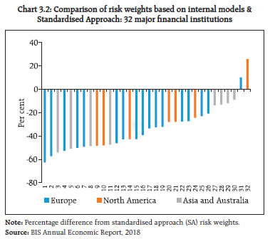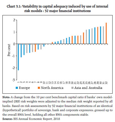 Following the global financial crisis, the revamped bank capital regime globally appears to have increased systemic resilience. In the global financial markets, transition to a post LIBOR world remains a work in progress. On the domestic front, the Reserve Bank initiated several policy measures to deepen the G-Sec and Repo markets. In the capital market, higher investment through SIPs in mutual funds remains a bright spot. The Securities and Exchange Board of India (SEBI) has taken several steps to further strengthen the surveillance and integrity of the derivatives, mutual funds and commodity derivatives markets besides enhancing disclosure and transparency standards for credit rating agencies. The new insolvency and bankruptcy regime, which came into effect in 2016 has been providing a market driven, time-bound process for insolvency resolution of a corporate debtor, thereby helping financial institutions to clean up their balance sheets. Most importantly, it is aiding a paradigm shift in the extant credit culture and discipline. Pension Fund Regulatory and Development Authority (PFRDA) continues to bring more and more citizens under the pension net. The regulator changed the investment guidelines for the National Pension System (NPS) to limit exposure to Equity Mutual Funds. With the initiation of the process to identify Domestic Systemically Important Insurers (DSII), implementation of risk-based capital (RBC) & Operationalisation of CERT-Fin, Insurance Regulatory and Development Authority of India (IRDAI) is trying to strengthen the resilience of the Insurance sector. Engagement with Fintech and Suptech is increasing. The challenge for the regulator is to balance efficiency with prudential measures to mitigate risks to be able to harness the opportunities offered by Fintech. Section A International and domestic developments I. Banks a) International regulatory and market developments 3.1 The Bank for International Settlements (BIS), in its Annual Economic Report (AER) released in June 20181 noted that Basel III capital requirements fortify banks against the risks of failure. Its findings show that the likelihood of a bank suffering distress within a 2-year period falls as its Tier-1 risk-based capital ratio increases and goes down further if a high leverage-based Tier-1 capital ratio is also maintained. The report highlighted the complementary nature of Tier-1 Capital ratio and the leverage ratio-based regulations. 3.2 The AER, however, notes two areas where it feels that more action is needed to increase resilience. The first concerns the link between resilience and regulatory reporting requirements leading to increasing risk of regulatory arbitrage. One such example relates to banks’ ‘window-dressing’ around regulatory reporting dates. The second area of concern, relates to the ‘outlook for bank profitability’. While significant progress has been made in terms of balance sheet and business model adjustments for banks, market valuations for many of them point to continued investor scepticism about their profitability prospects. Such scepticism about the valuation depresses market-based resilience measure such as the market leverage ratio or credit default swap spreads; in other words, investors penalise banks for poor profitability outlook, prompting them not to undermine the importance of maintaining short-term profit projections even if such outcomes are beneficial in the long run. 3.3 The AER also argues that constraints on banks’ internal models are required to prevent the ‘gaming’ of capital requirements and to make risk-weighted asset (RWA) measures more comparable across the sector. A BCBS2 study referred to in the report finds that such ‘unwarranted’ variability can be material. The study, which assumes a benchmark capital ratio of 10 per cent shows that two banks with identical banking book assets might report capital ratios that show a difference of up to 4 percentage points (Chart 3.1). Additionally, the study also finds that in many cases, internally modelled risk weights were substantially lower than those under the standardised approach – for corporate exposures, by up to more than 60 per cent (Chart 3.2) and such an observed wedge and associated capital relief are difficult to justify. Such gaming of capital requirements may also have implications for model-based expected credit loss (ECL) estimation under the International Financial Reporting Standards (IFRS). 3.4 Central banks and financial market regulators have set in motion a drive to reform the interest rate benchmarks3. These benchmarks are referenced for a large volume and broad range of financial products and contracts including derivatives, loans and securities. The Financial Stability Board (FSB) has been monitoring progress on three work streams viz., (1) strengthening the inter-bank offer rates (IBORs) by fixing them to a greater number of transactions, (2) identifying appropriate alternative risk-free rates and encouraging derivatives to be referenced to them instead of the IBORs and, (3) having robust fall-back provisions for the contracts referenced to IBORs to reduce financial instability if an IBOR is discontinued.   3.5 About USD 350 trillion worth of contracts across the globe are pegged to LIBOR which is the key interest rate benchmark for several major currencies. Many of the current contracts would extend beyond 2021 (it has been proposed that LIBOR would cease to exist beyond this). The transition to alternative reference rates will involve considerable efforts for users of LIBOR for amending the contracts and updating the systems. Yet, when it comes to such a significant reform, the authorities concerned are not retreating in the matured financial markets. 3.6 On its part, the Federal Reserve (US FED) recently started disseminating three new benchmark rates. One of these, the Secured Overnight Financing Rate (SOFR) is endorsed by the Federal Reserve Bank of New York as a